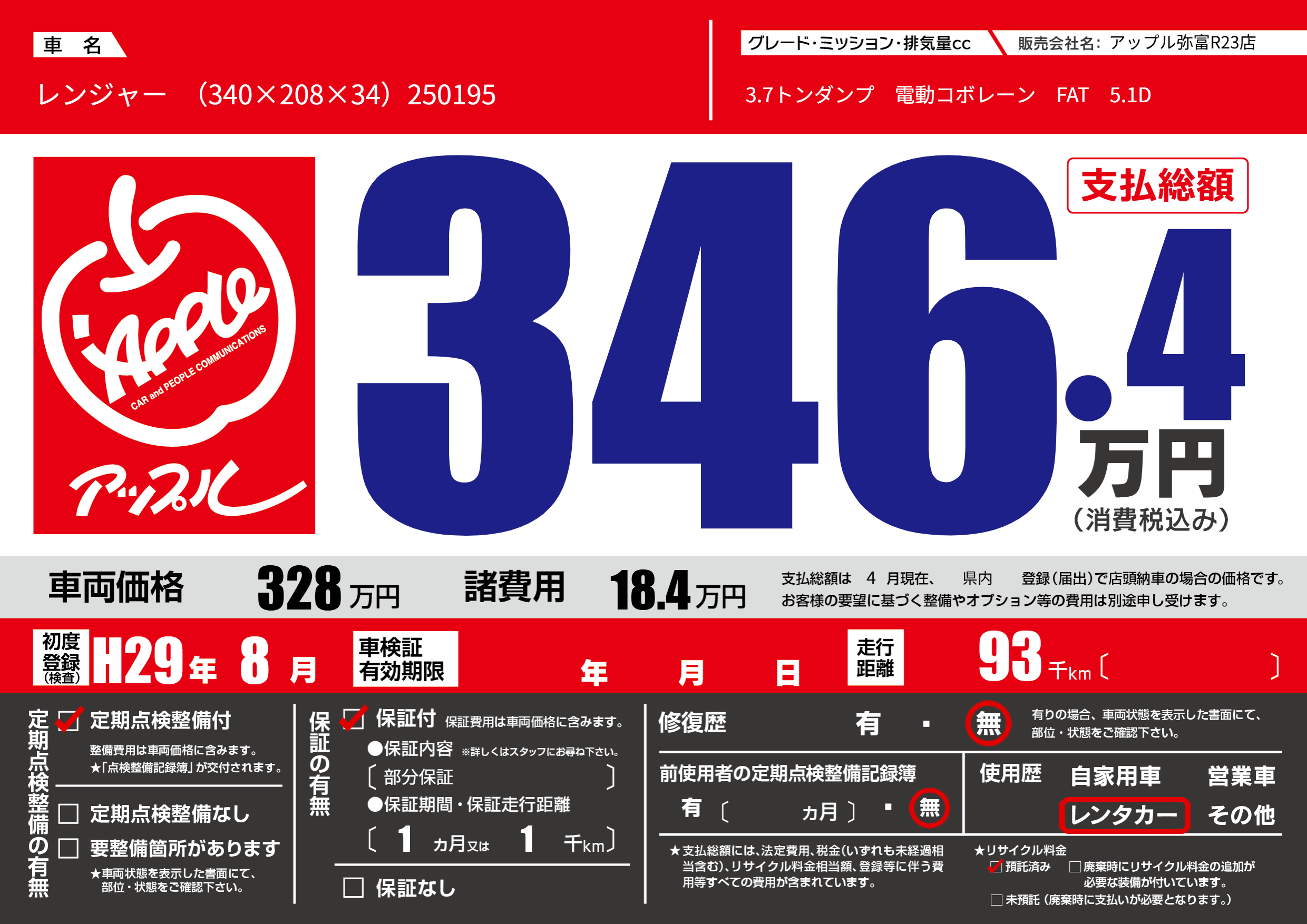 | 車名 | レンジャー (340×208×34)250195 | グレード ミッション 排気量 |