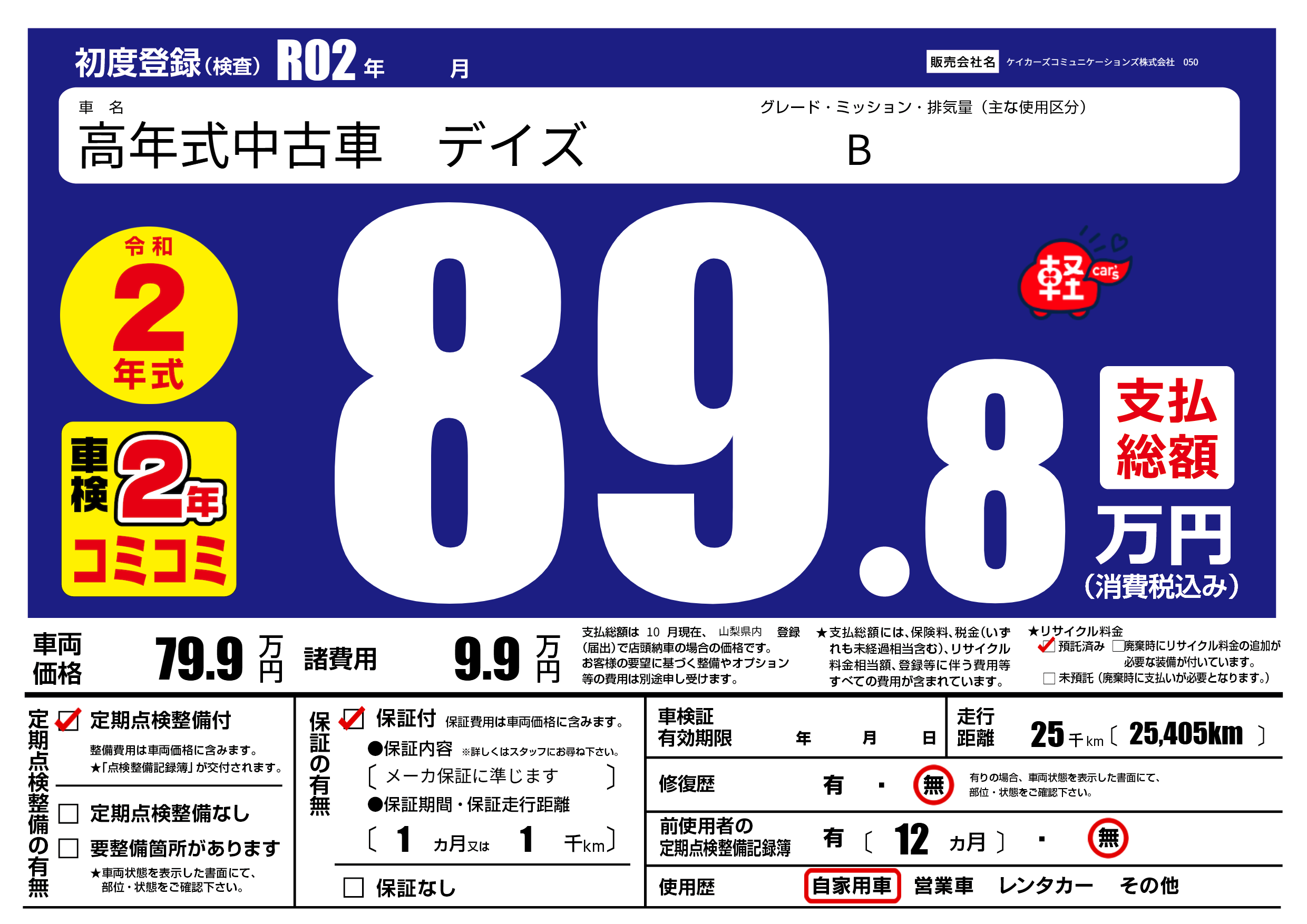 | 車名 | 高年式中古車 デイズ | グレード ミッション 排気量 |