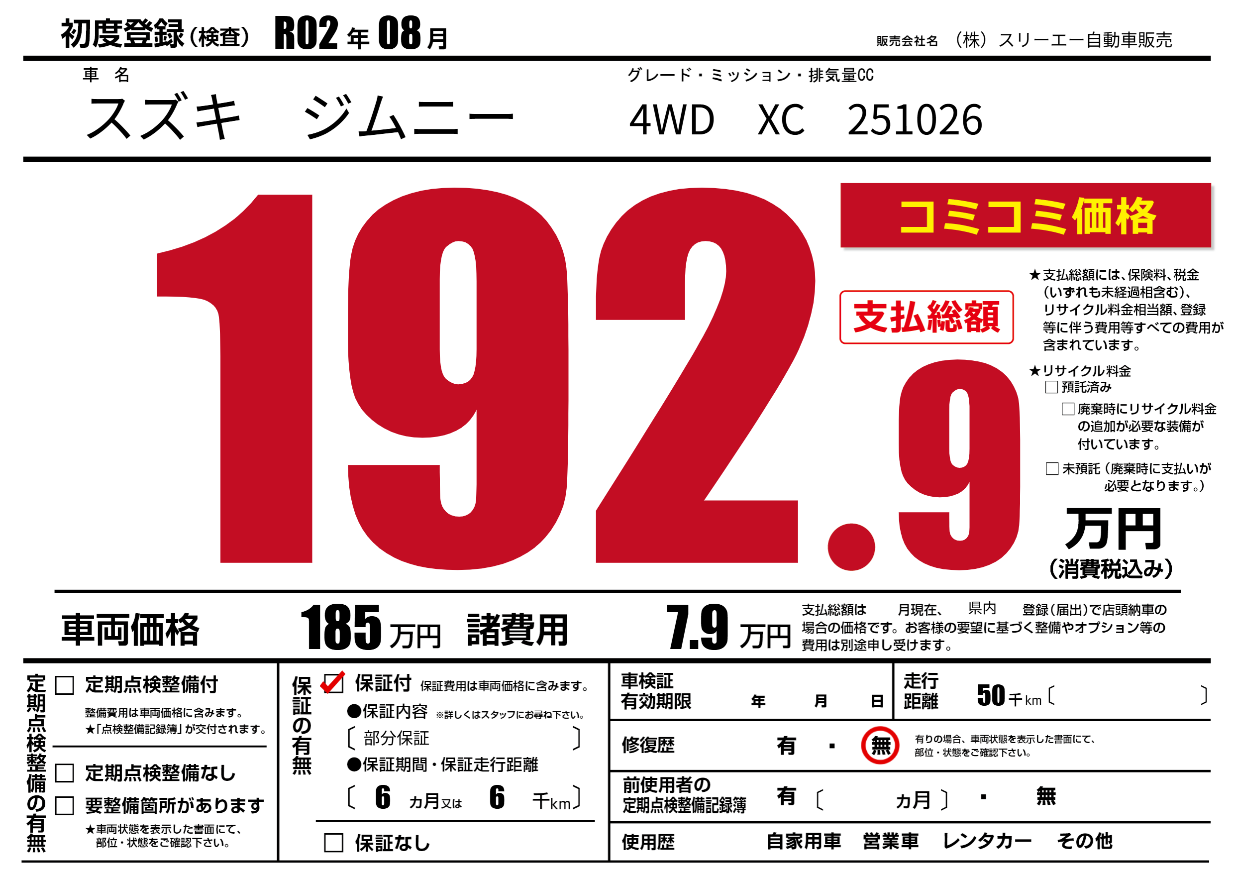 保証付き 保証内容(部分保証) 6ヶ月または(6)千kmまで |
