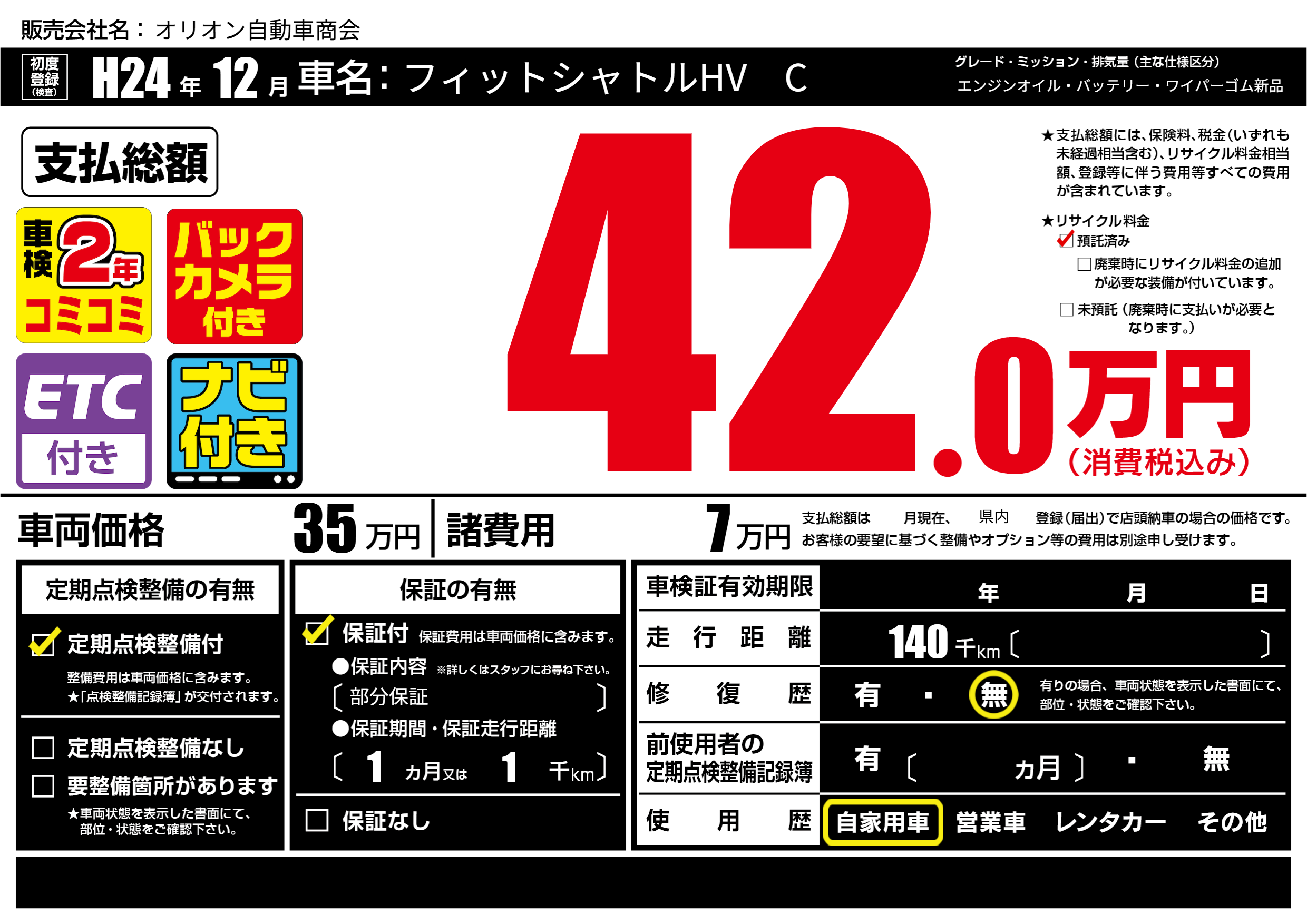 | 走行キロ | 14万km | 初年度登録 | H24年12月 |