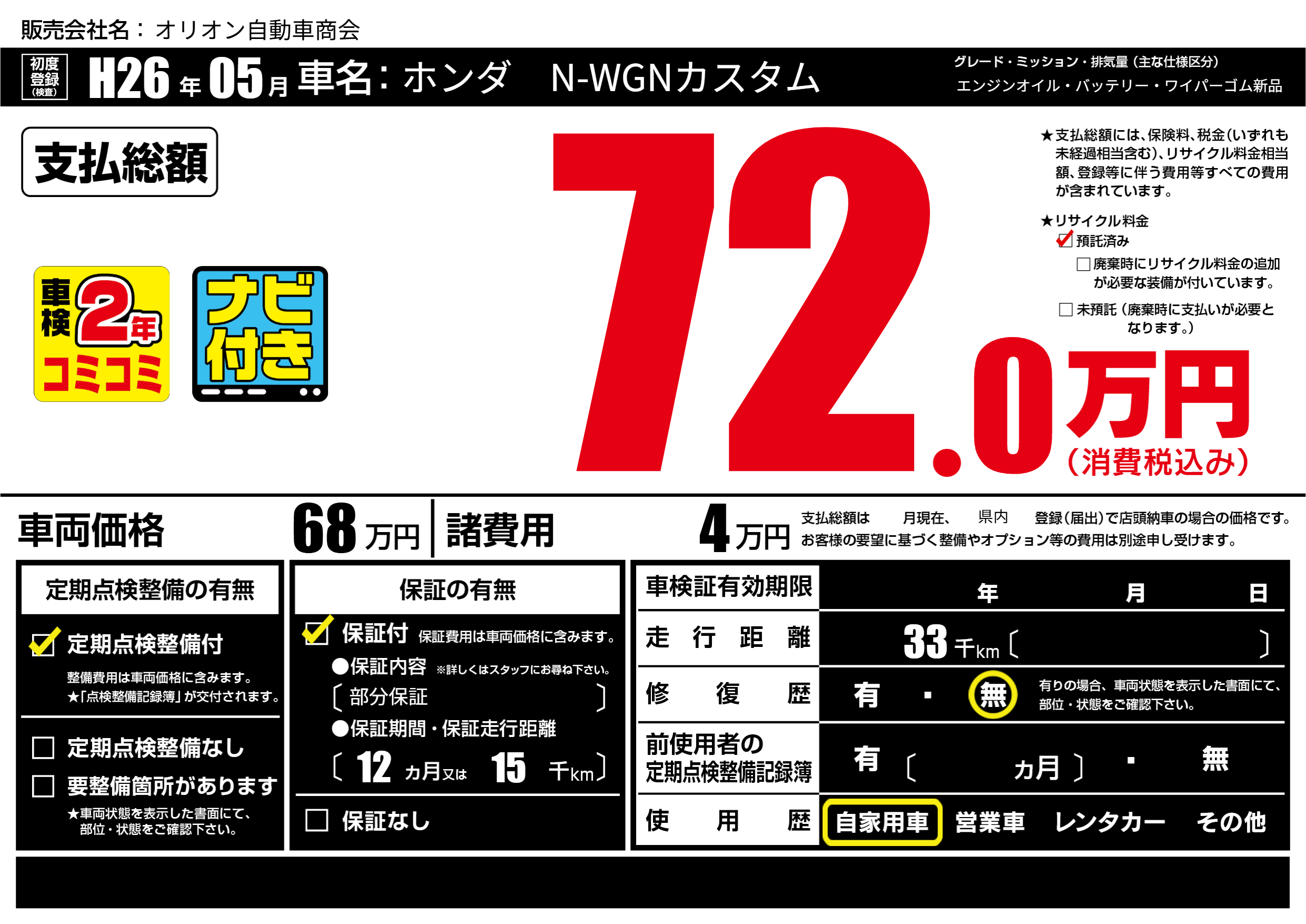 | 車名 | ホンダ N-WGNカスタム | グレード ミッション 排気量 |