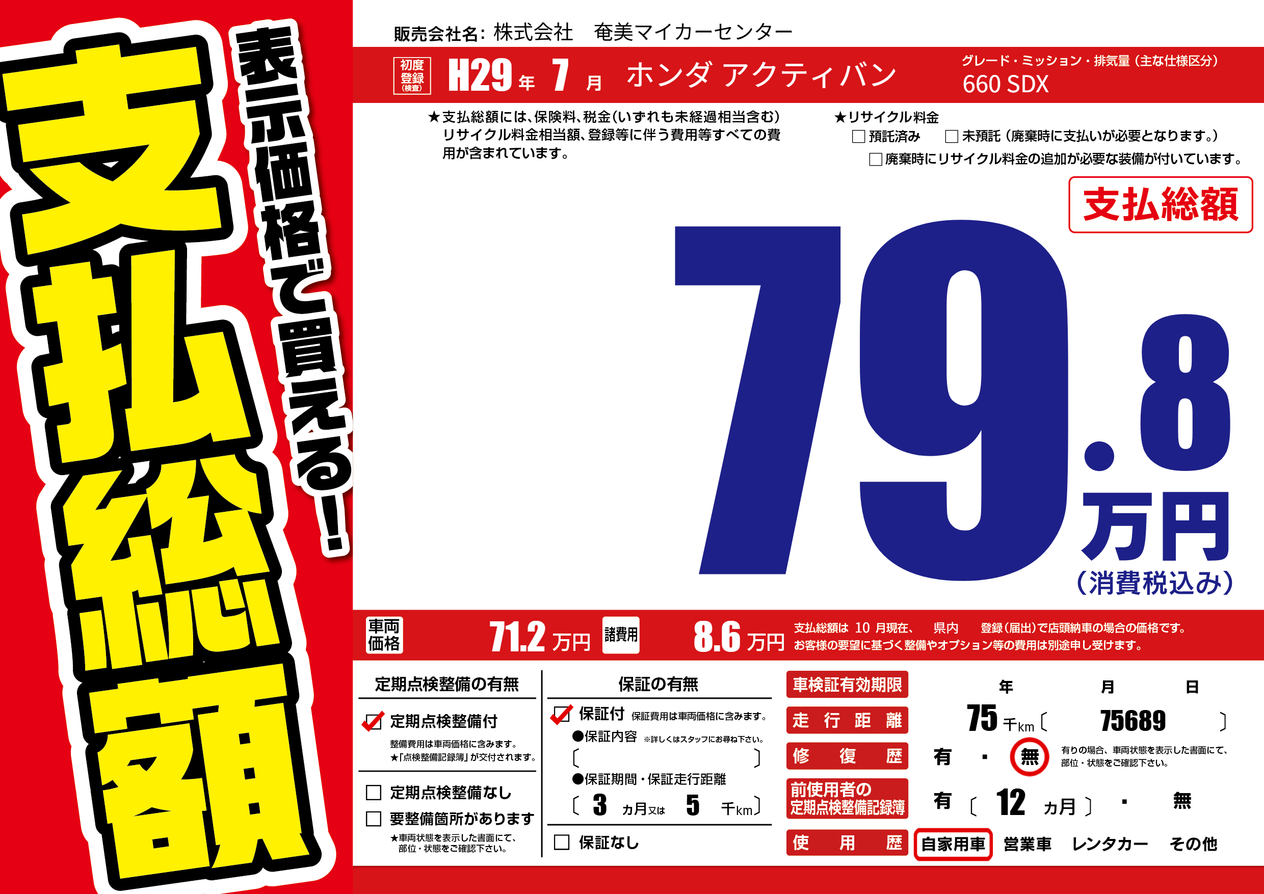 | 走行キロ | 7.5万km | 初年度登録 | H29年7月 |