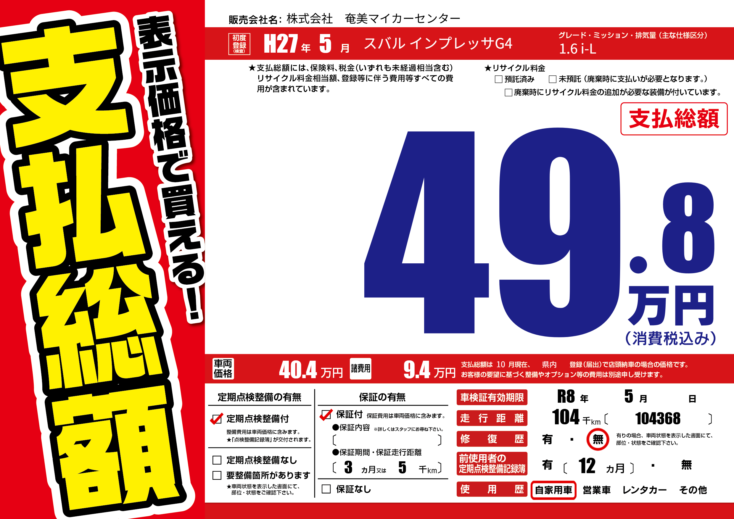 | 車名 | スバル インプレッサG4 | グレード ミッション 排気量 |