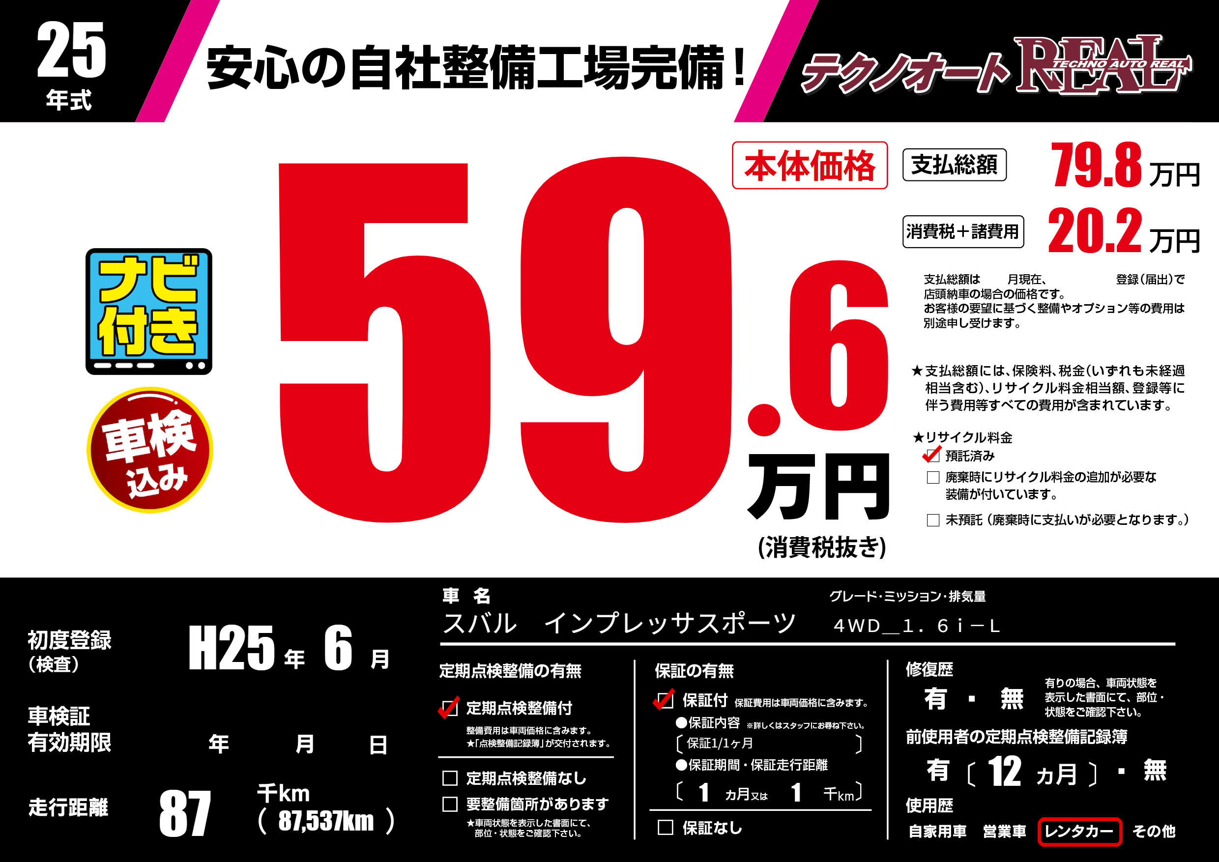 | 走行キロ | 8.7万km | 初年度登録 | H25年6月 |