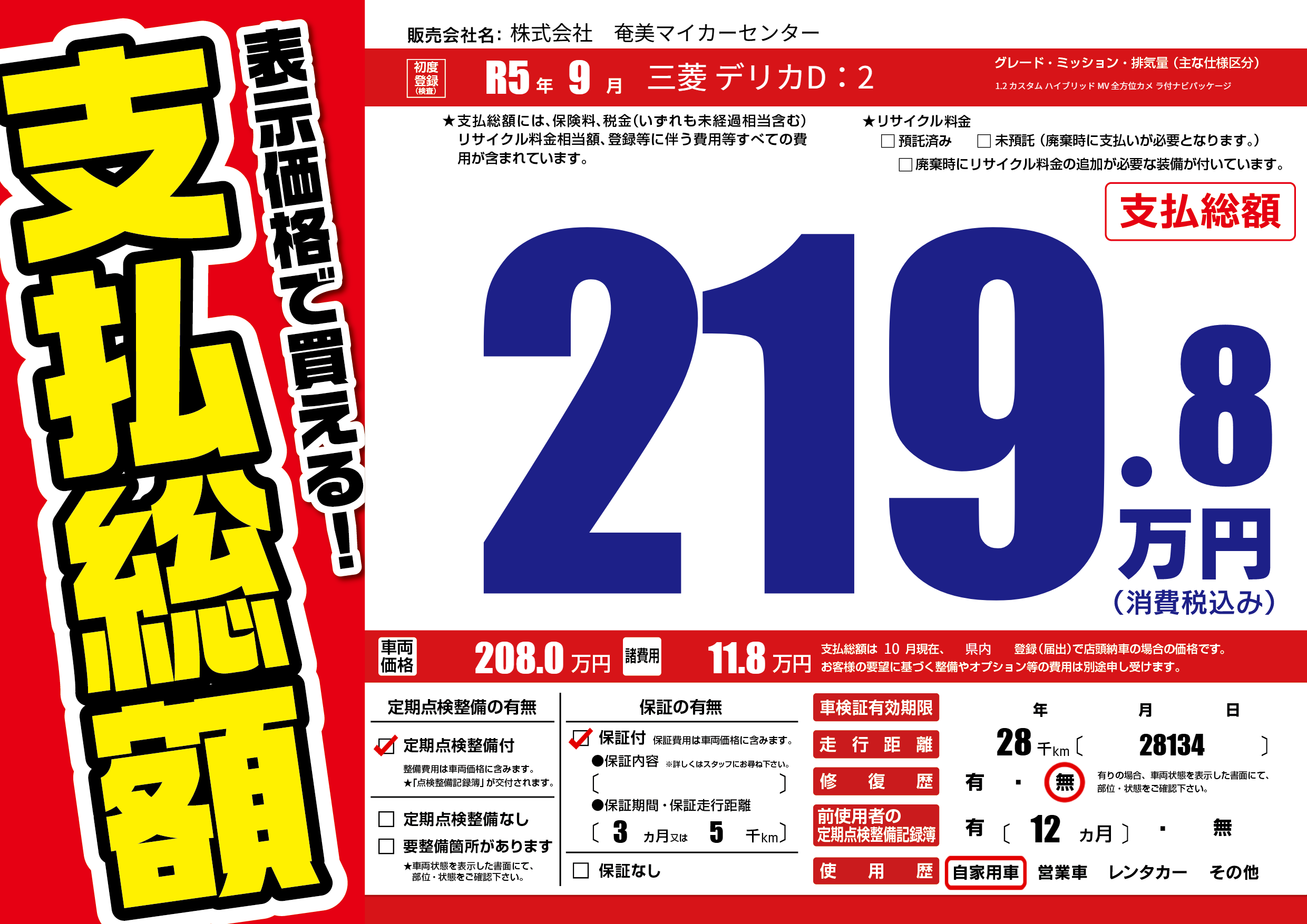 | 走行キロ | 2.8万km | 初年度登録 | R5年9月 |
