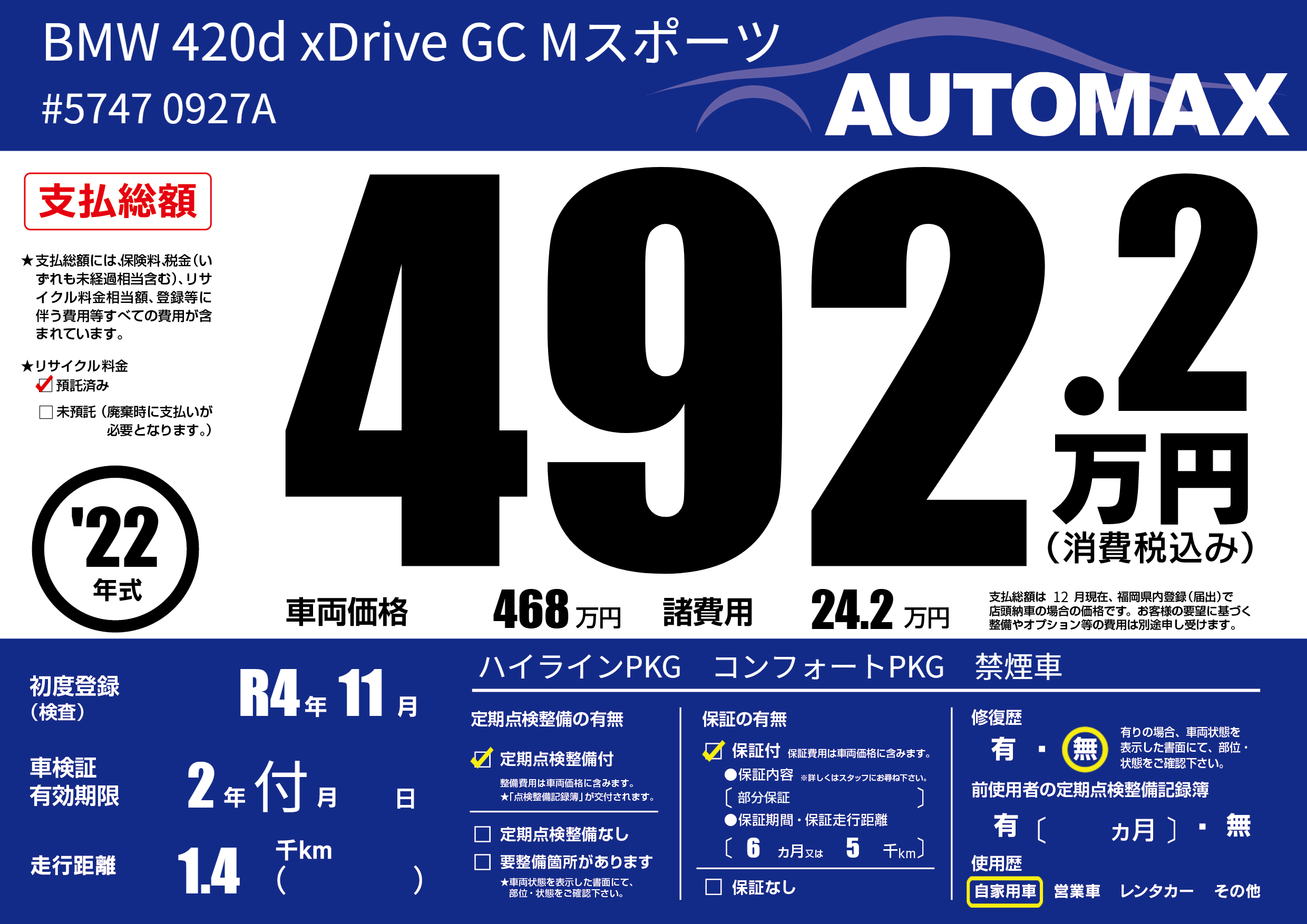 | 車名 | BMW 420d xDrive GC Mスポーツ | グレード ミッション 排気量 |
