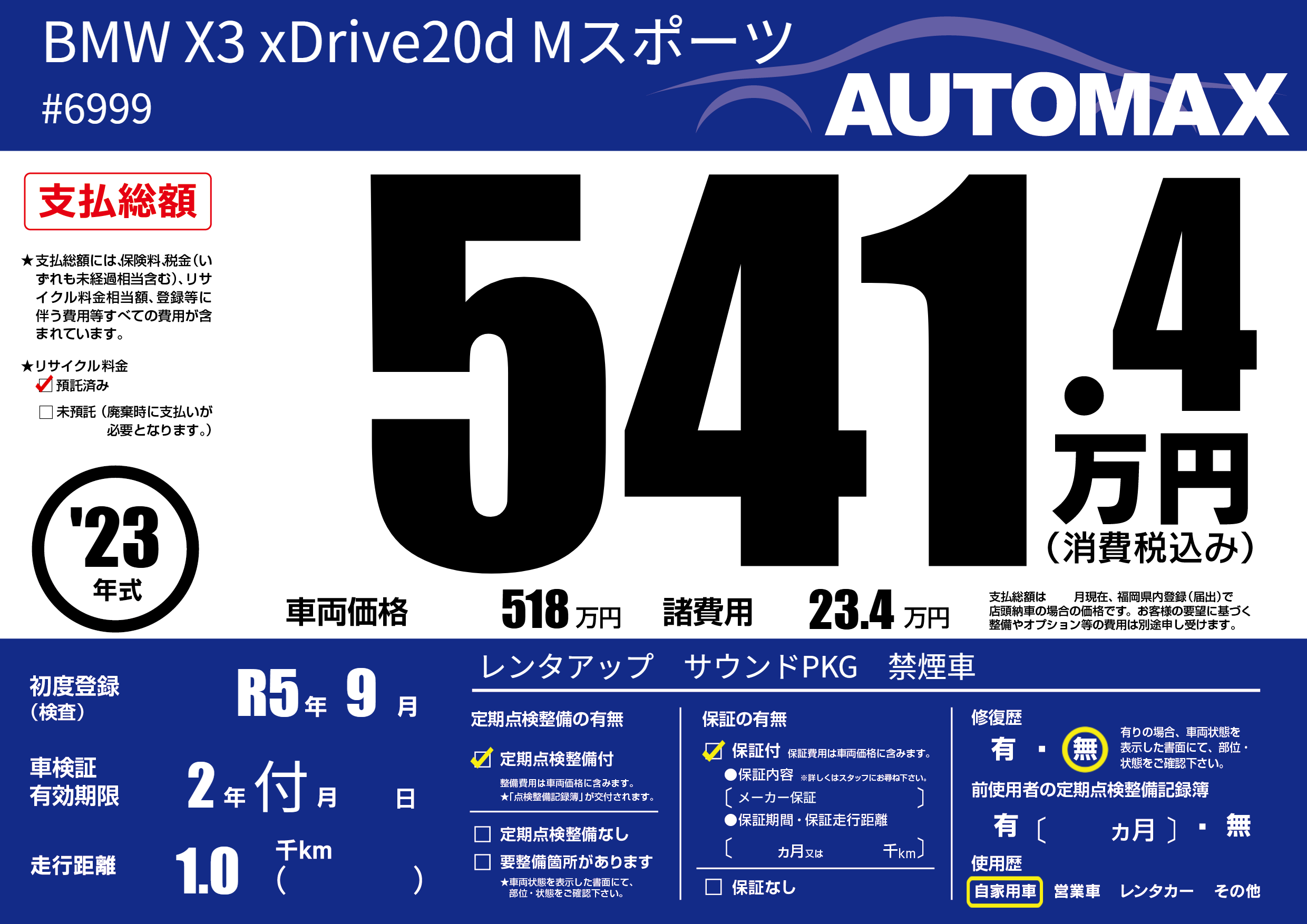 | 車名 | BMW X3 xDrive20d Mスポーツ | グレード ミッション 排気量 |