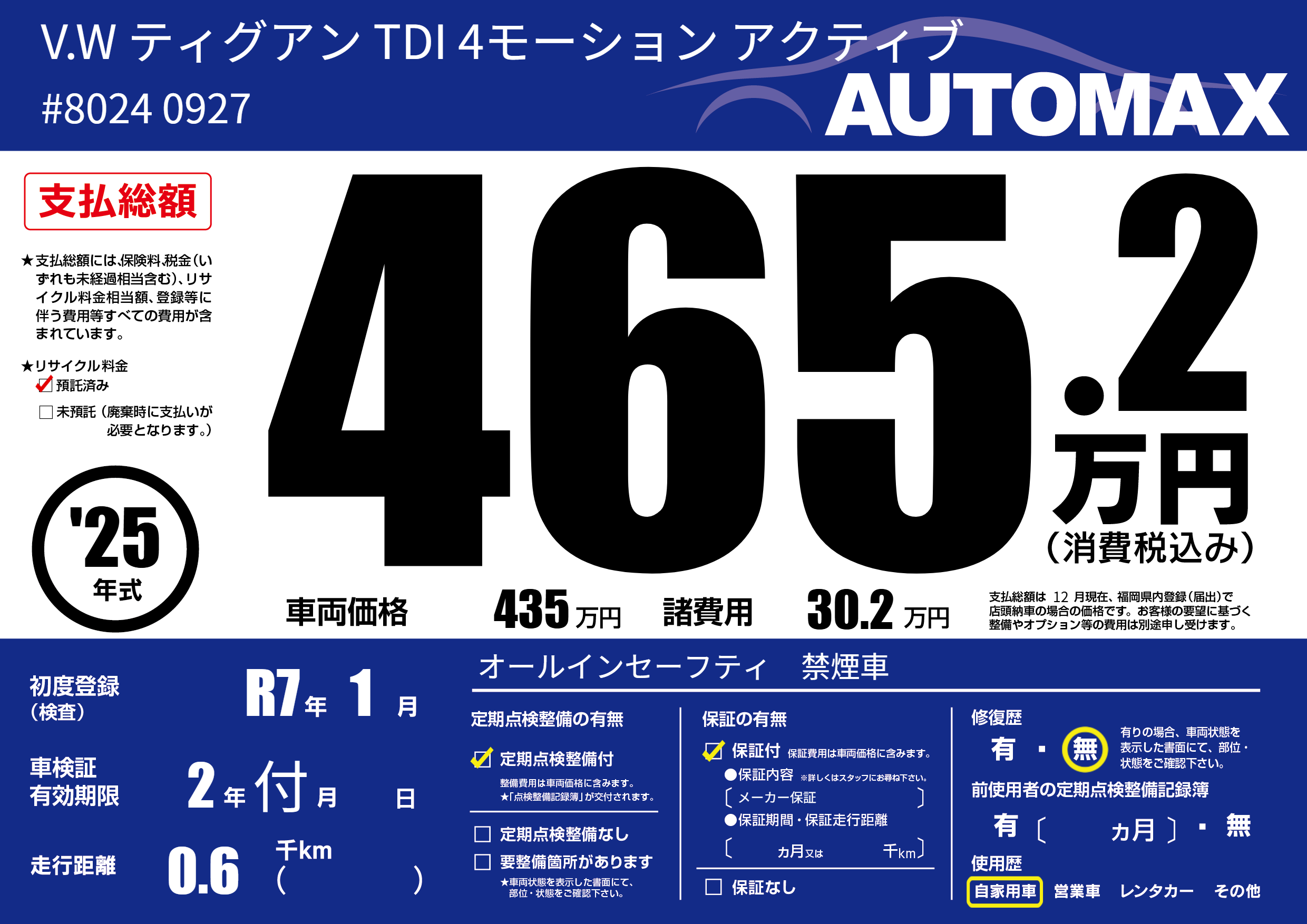 | 車名 | V.W ティグアン TDI 4モーション アクティブ | グレード ミッション 排気量 |
