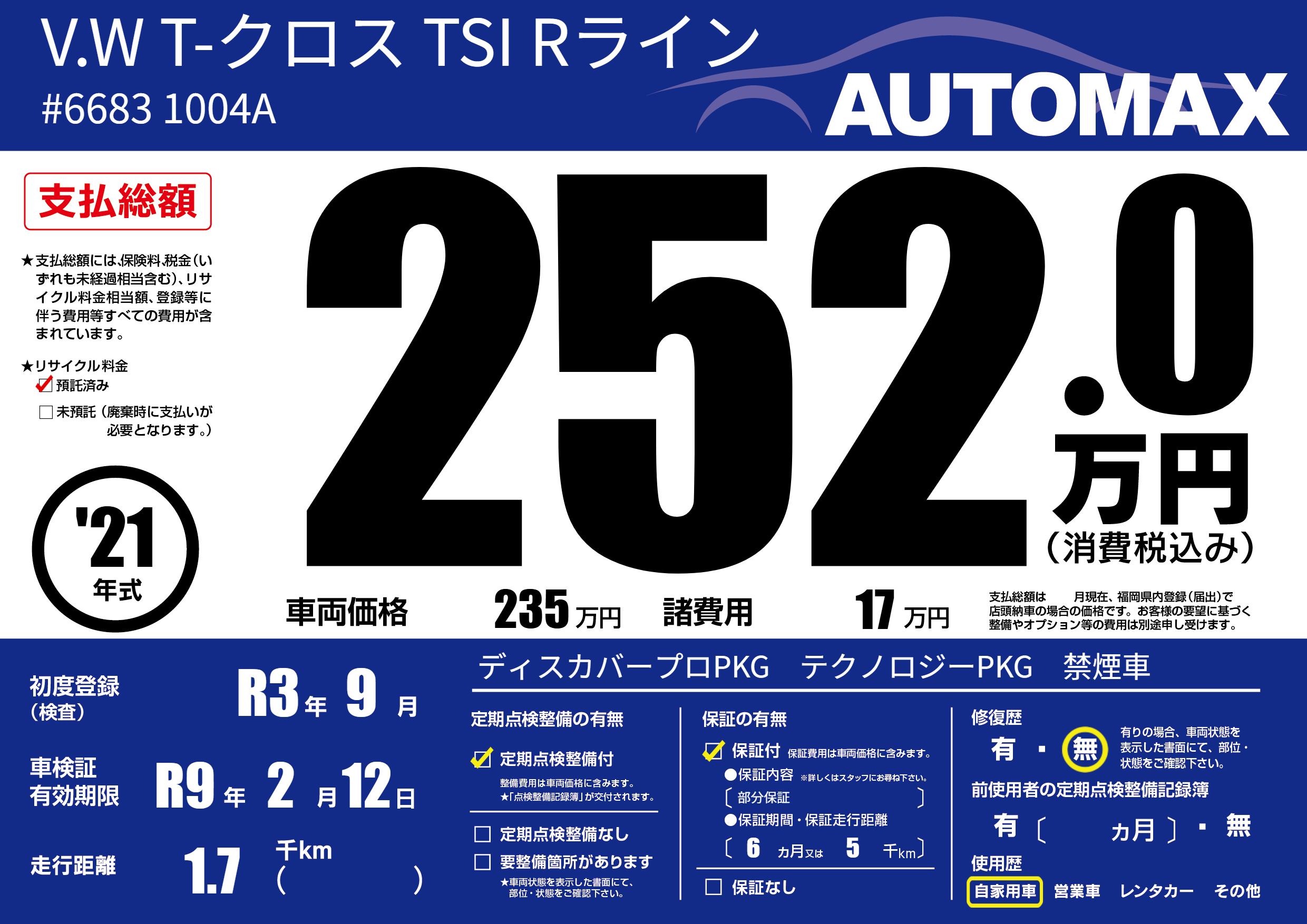 | 車名 | V.W T-クロス TSI Rライン | グレード ミッション 排気量 |