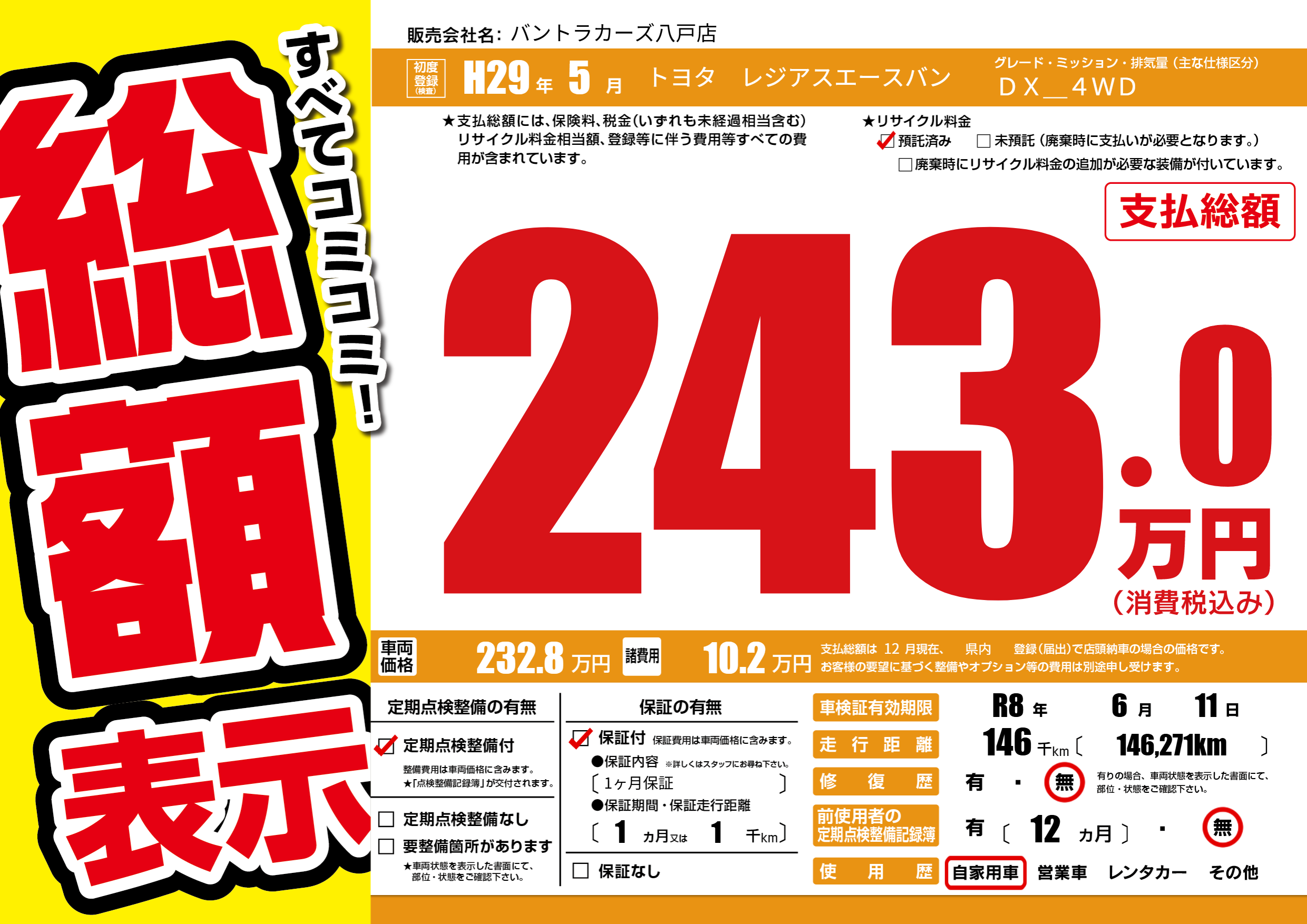 | 走行キロ | 14.6万km | 初年度登録 | H29年5月 |