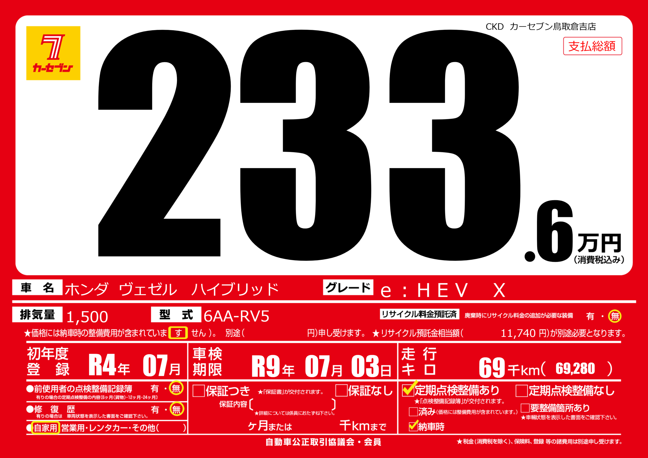 | 車検制限 | R9年 07月 03日 | ||