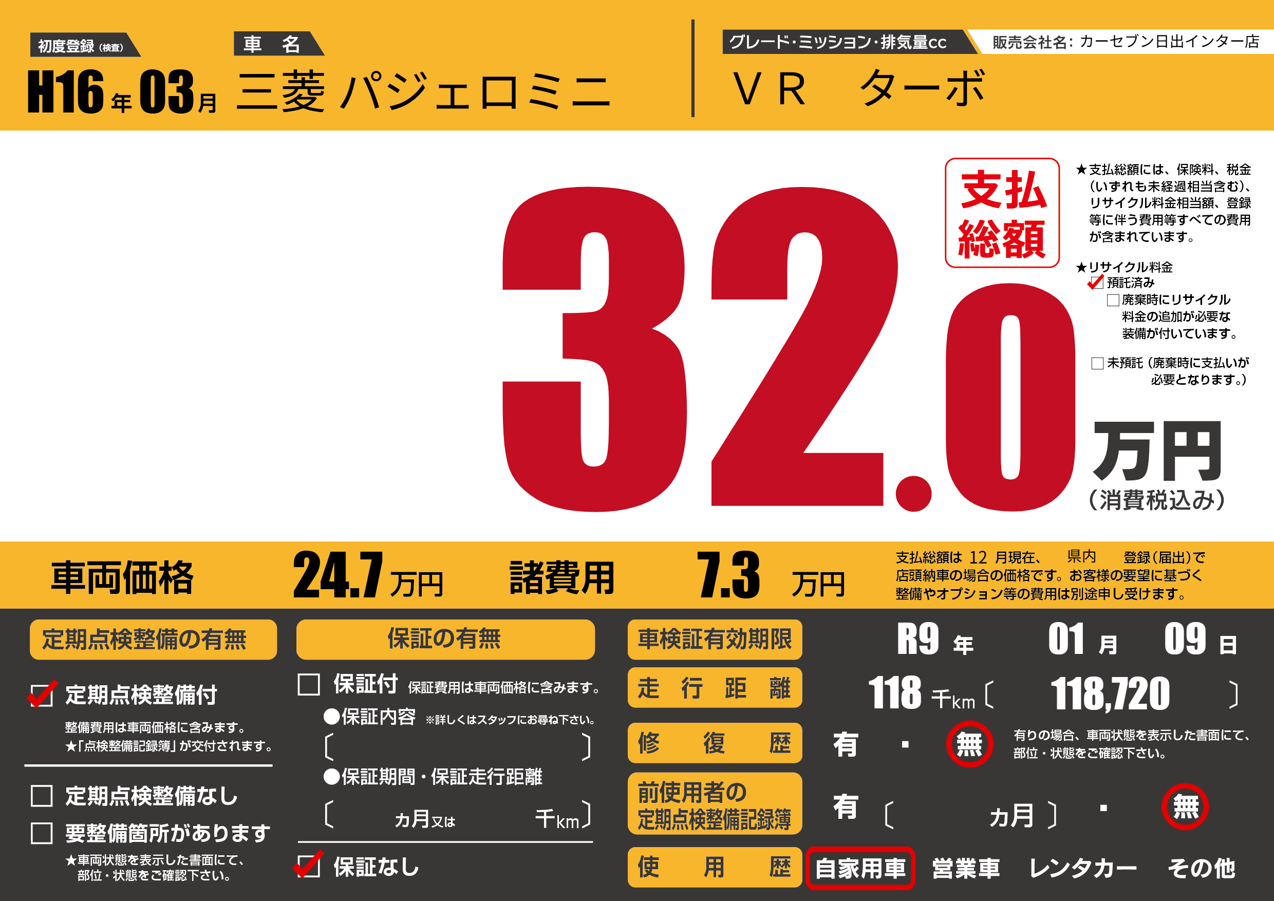| 車名 | 三菱 パジェロミニ | グレード ミッション 排気量 |