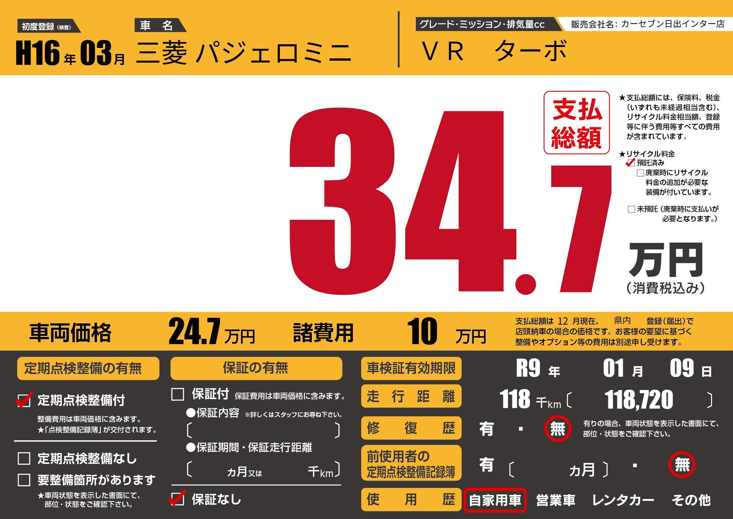 | 車名 | 三菱 パジェロミニ | グレード ミッション 排気量 |