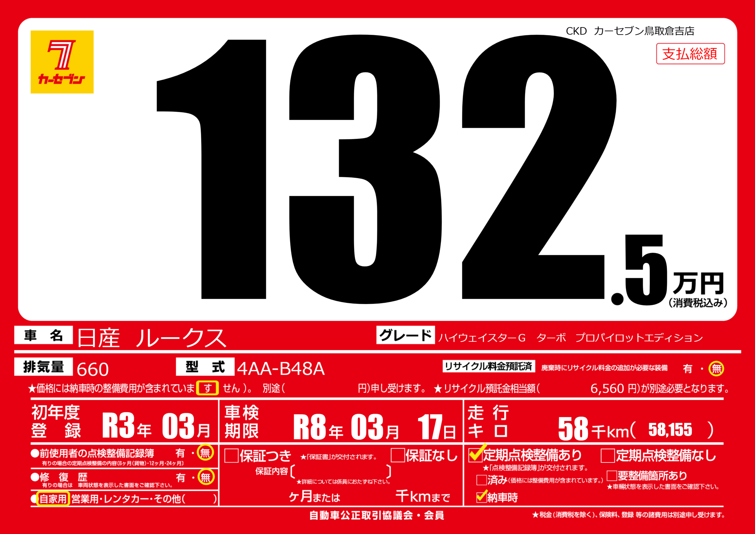 | 車名 | 日産 ルークス | グレード ミッション 排気量 |