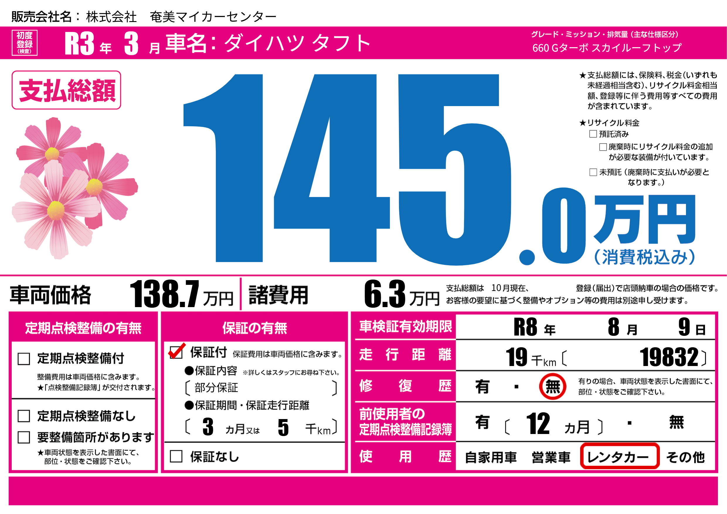 | 車検制限 | R8年 8月 9日 | ||