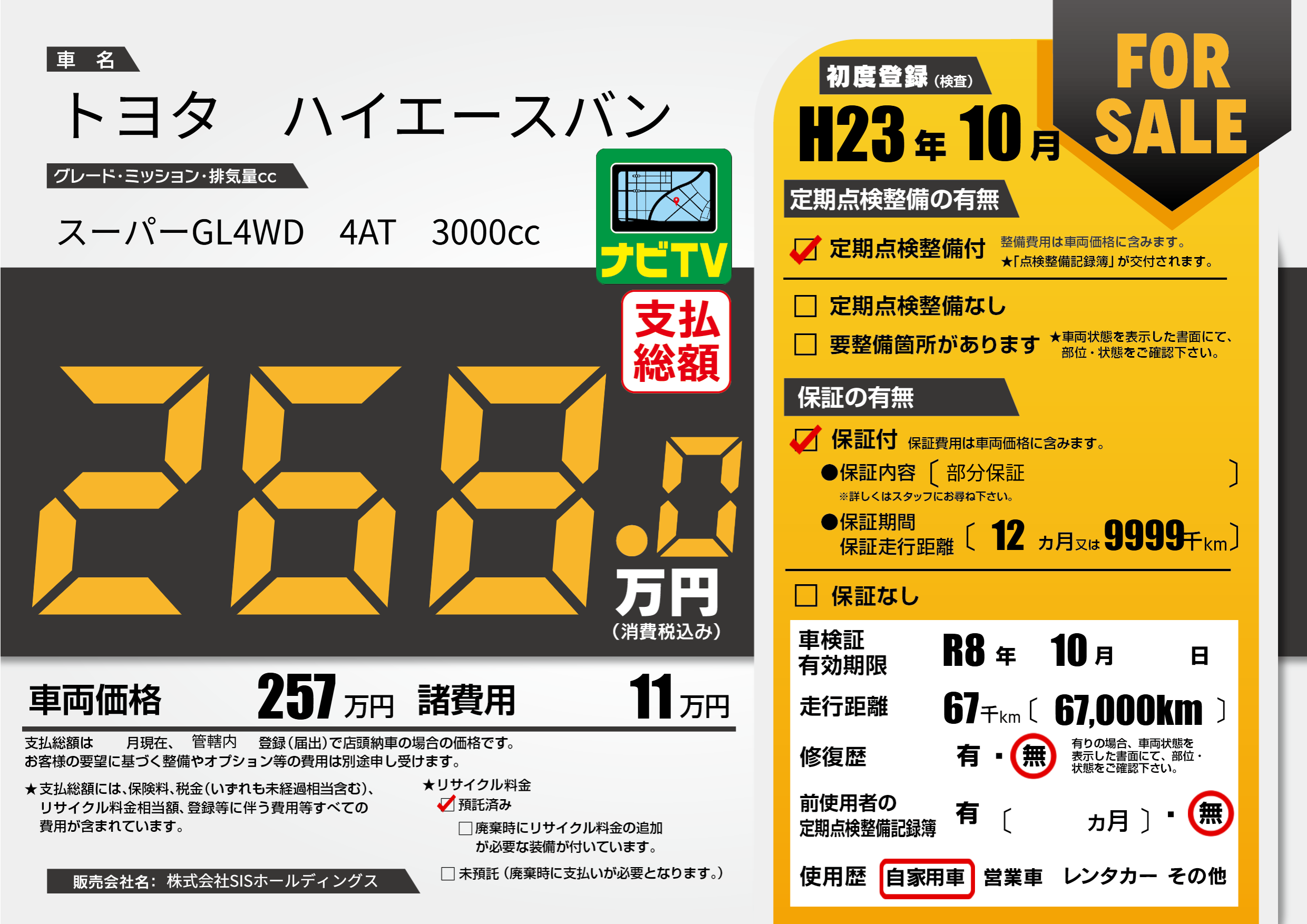 | 走行キロ | 6.7万km | 初年度登録 | H23年10月 |