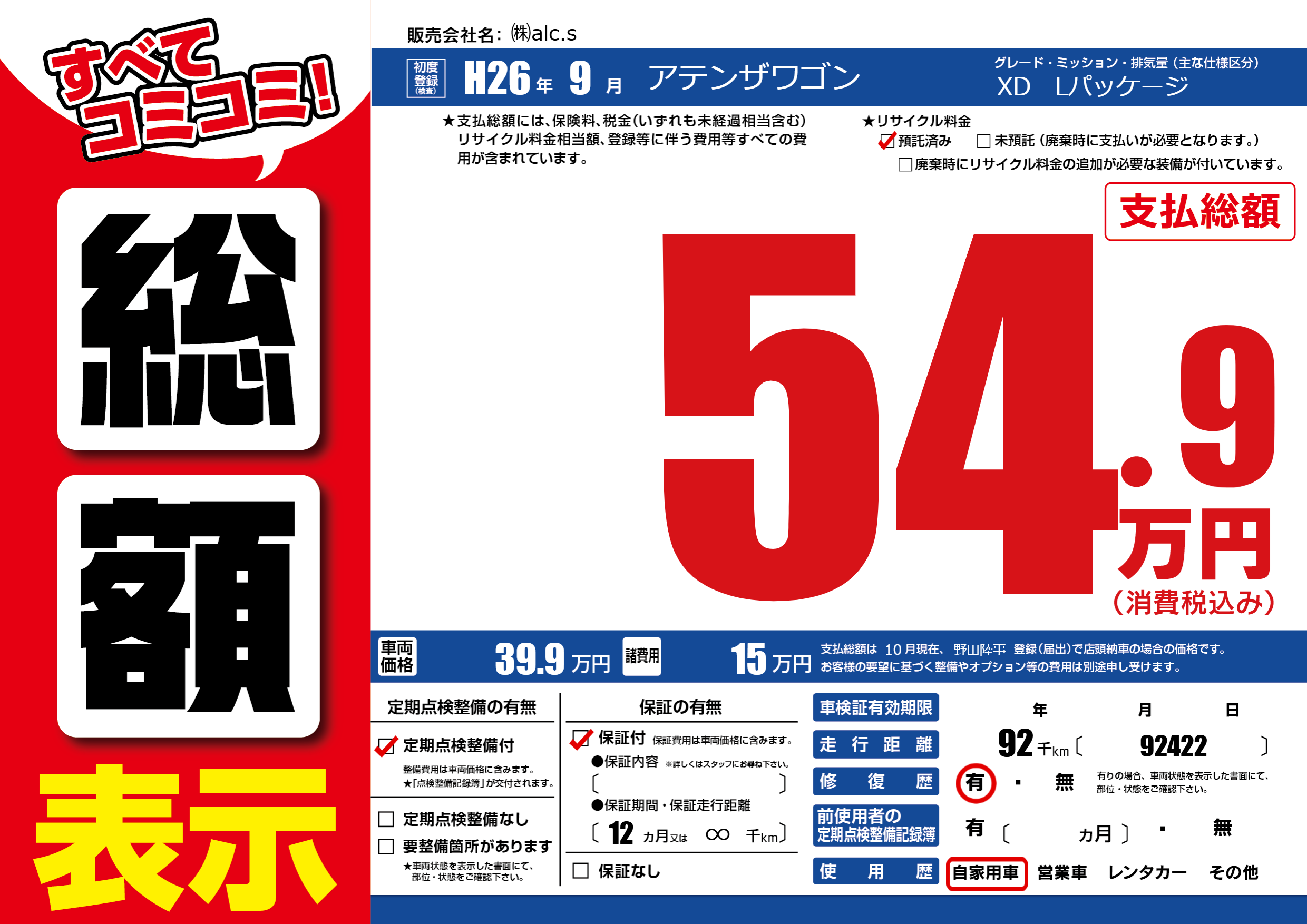 | 走行キロ | 9.2万km | 初年度登録 | H26年9月 |
