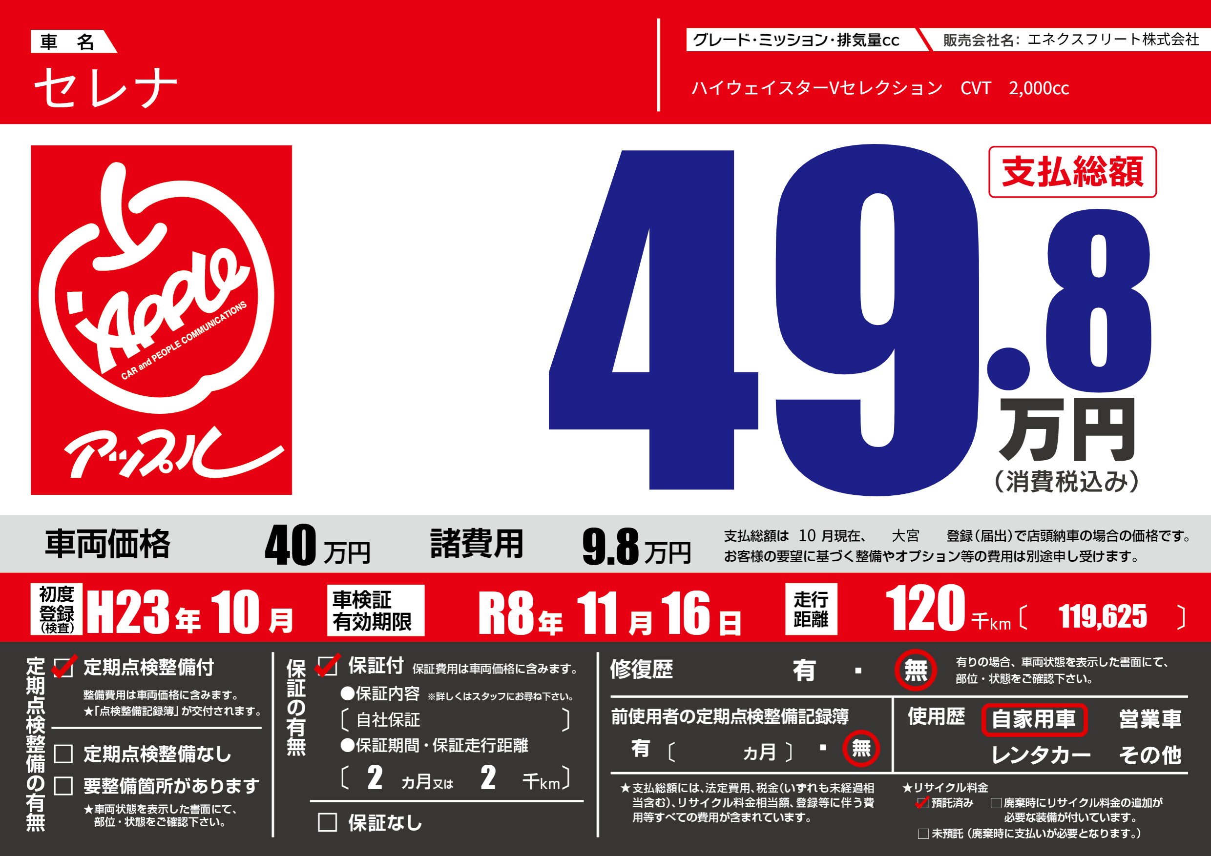 | 定期点検整備 | 定期点検整備あり | ||