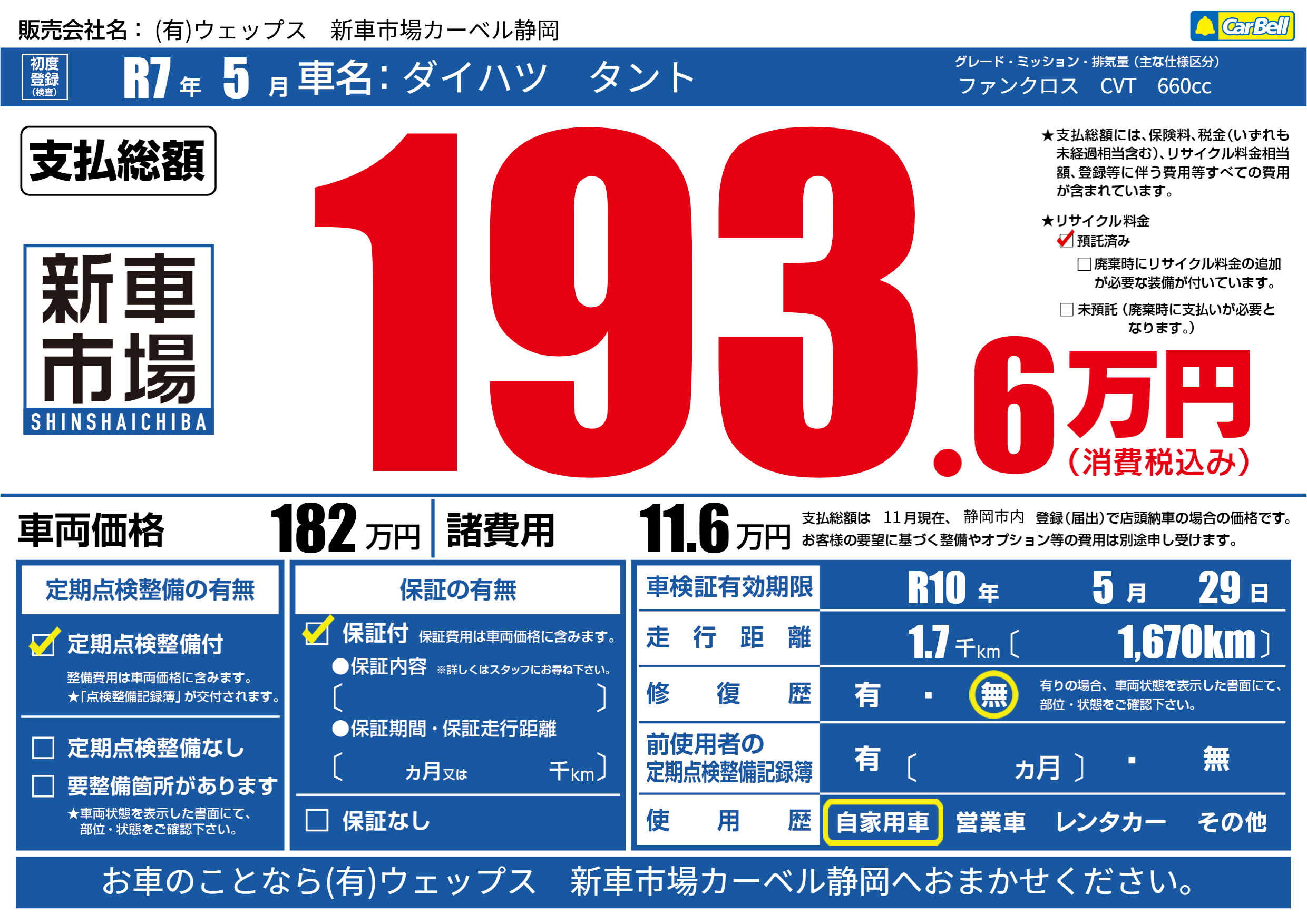 | 走行キロ | 0.1万km | 初年度登録 | R7年5月 |