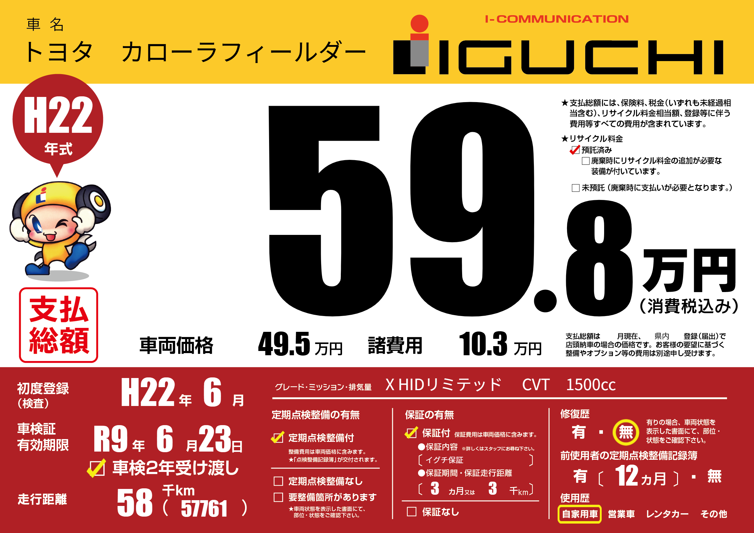 | 走行キロ | 5.8万km | 初年度登録 | H22年6月 |