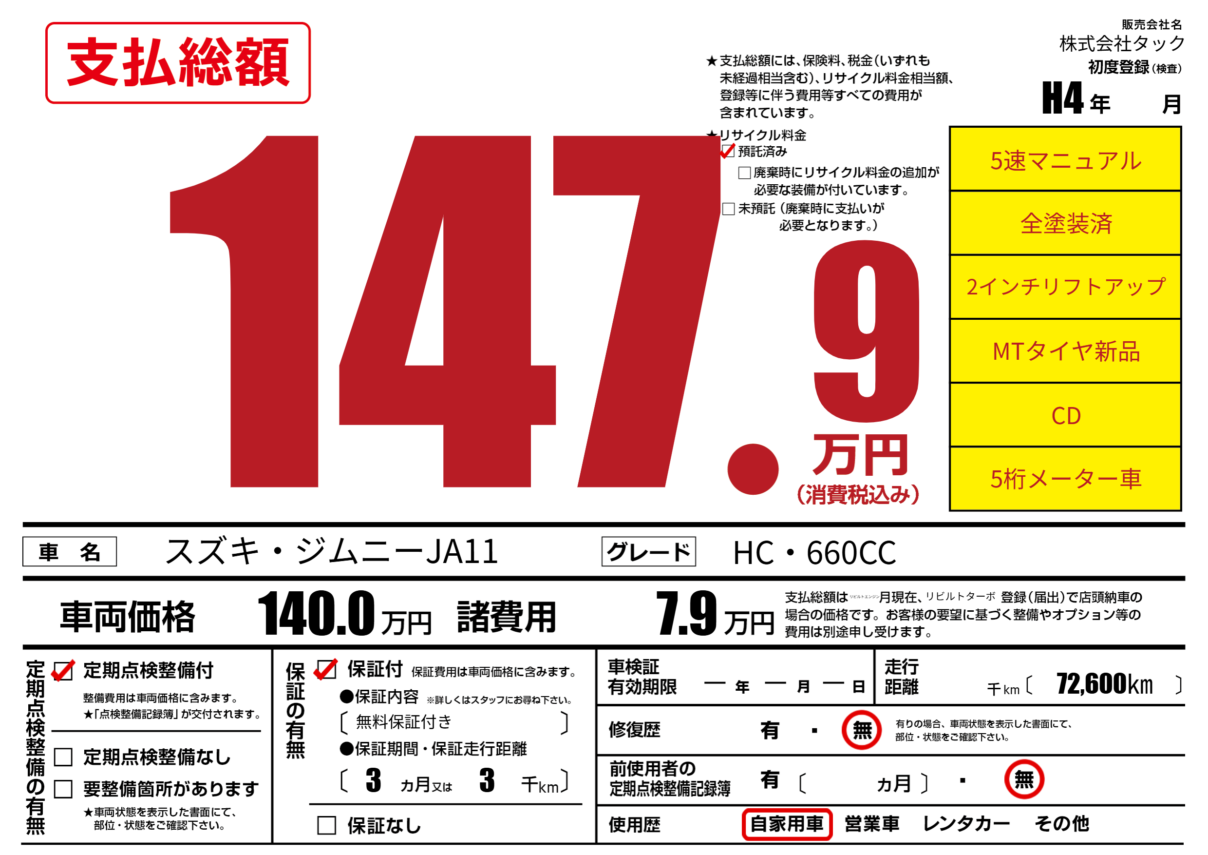 | 車名 | スズキ・ジムニーJA11 | グレード ミッション 排気量 |