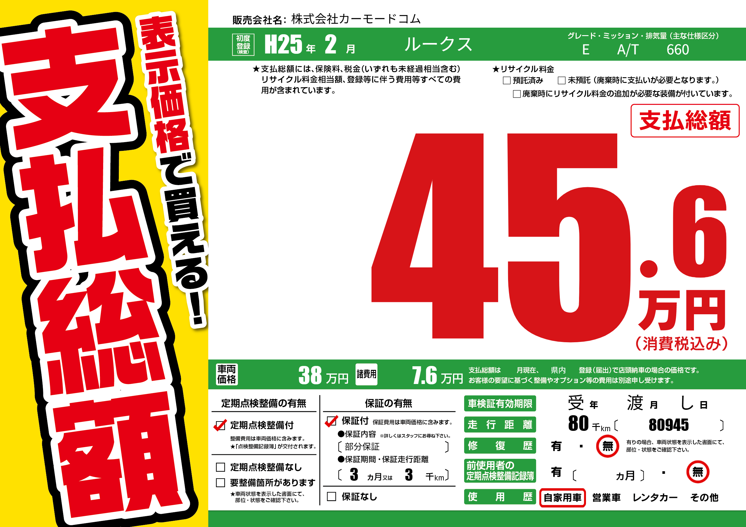 | 走行キロ | 8万km | 初年度登録 | H25年2月 |