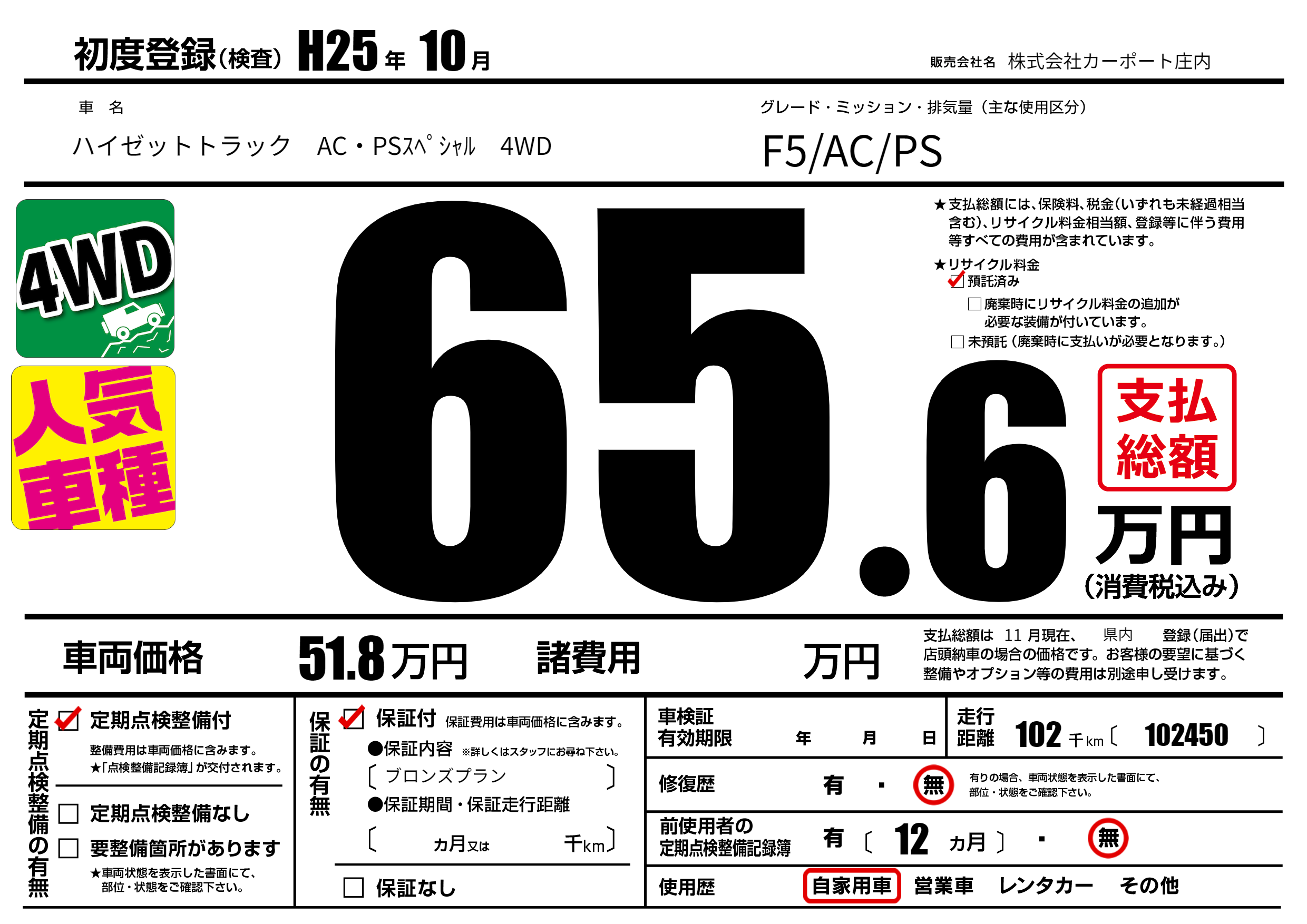 | 走行キロ | 10.2万km | 初年度登録 | H25年10月 |