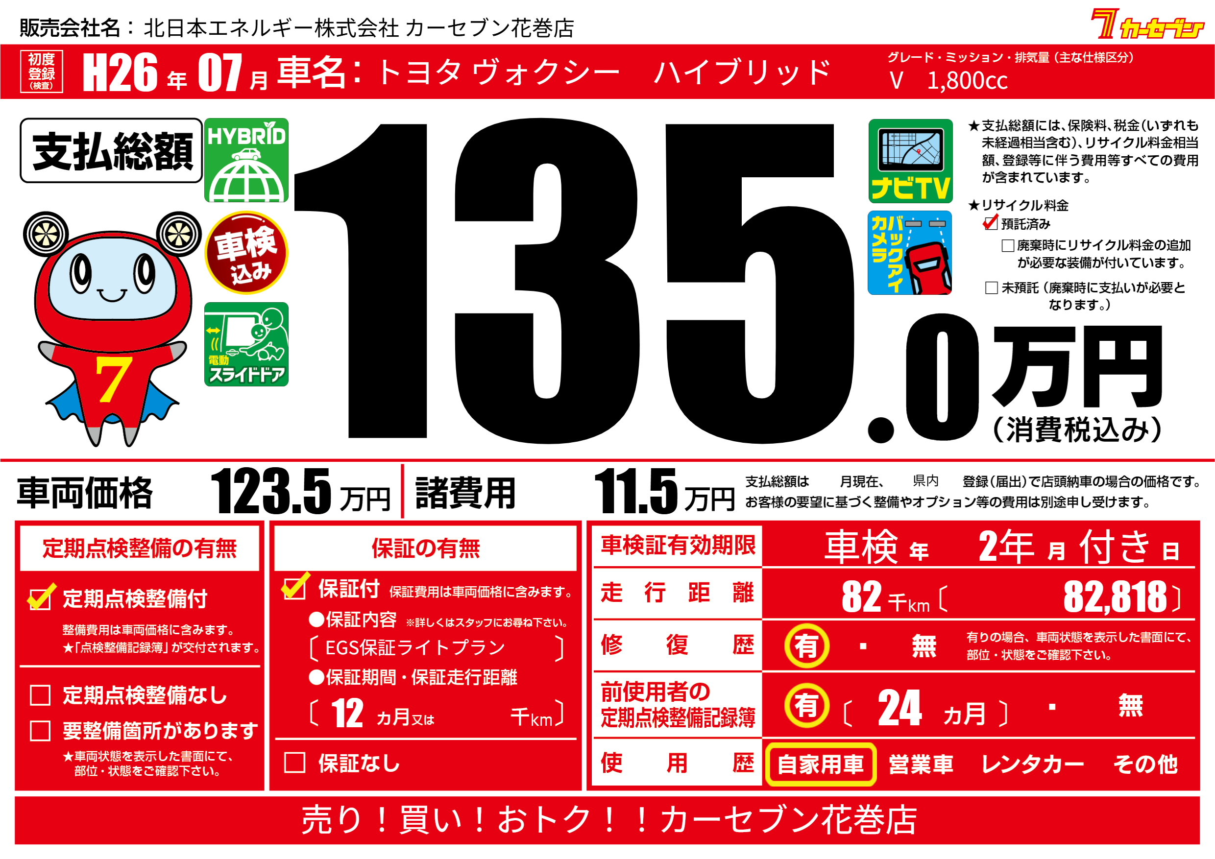 | 走行キロ | 8.2万km | 初年度登録 | H26年07月 |