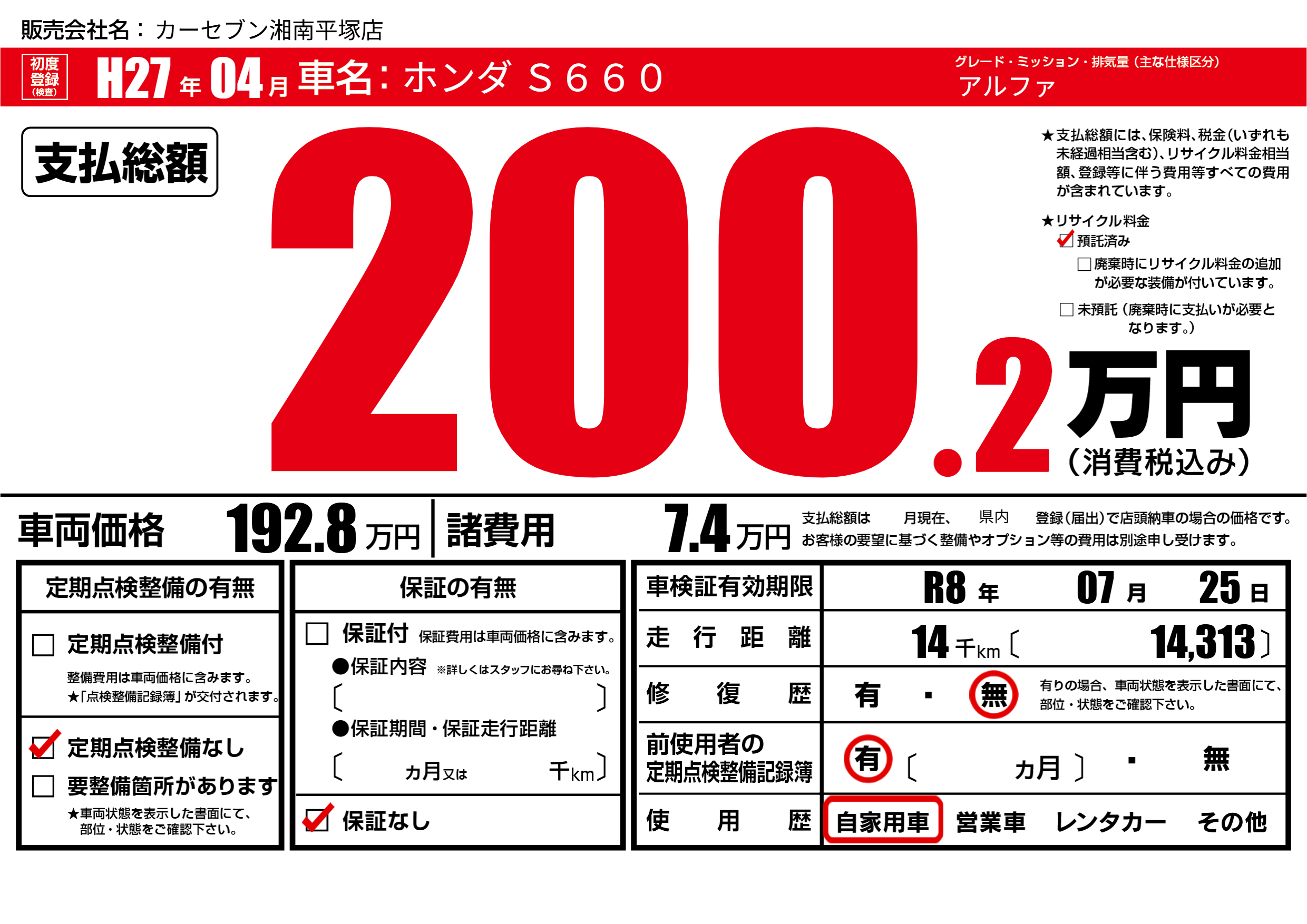 | 車名 | ホンダ S660 | グレード ミッション 排気量 |