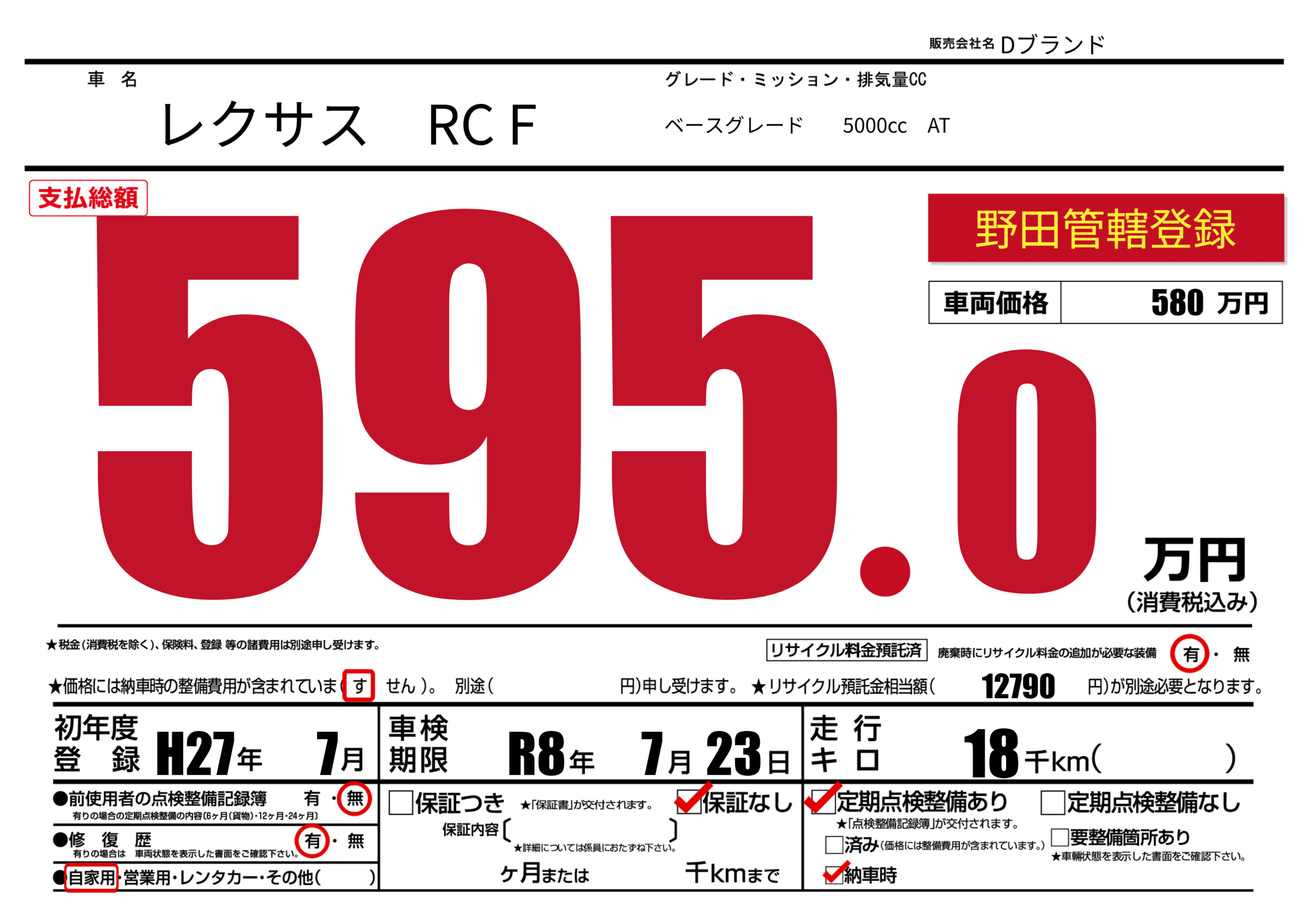 | 車名 | レクサス RC F | グレード ミッション 排気量 |