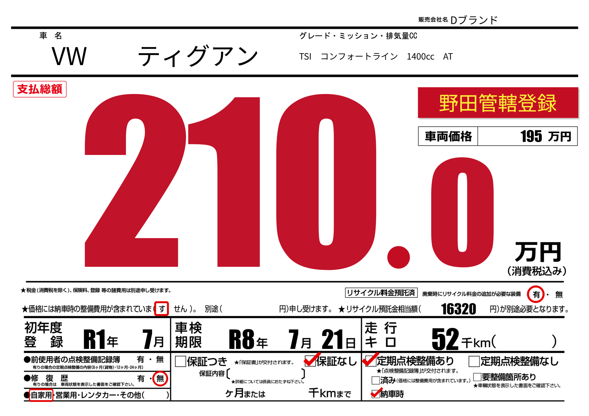 あり | リサイクル預託金相当額 | ( 16320円)が別途必要 |