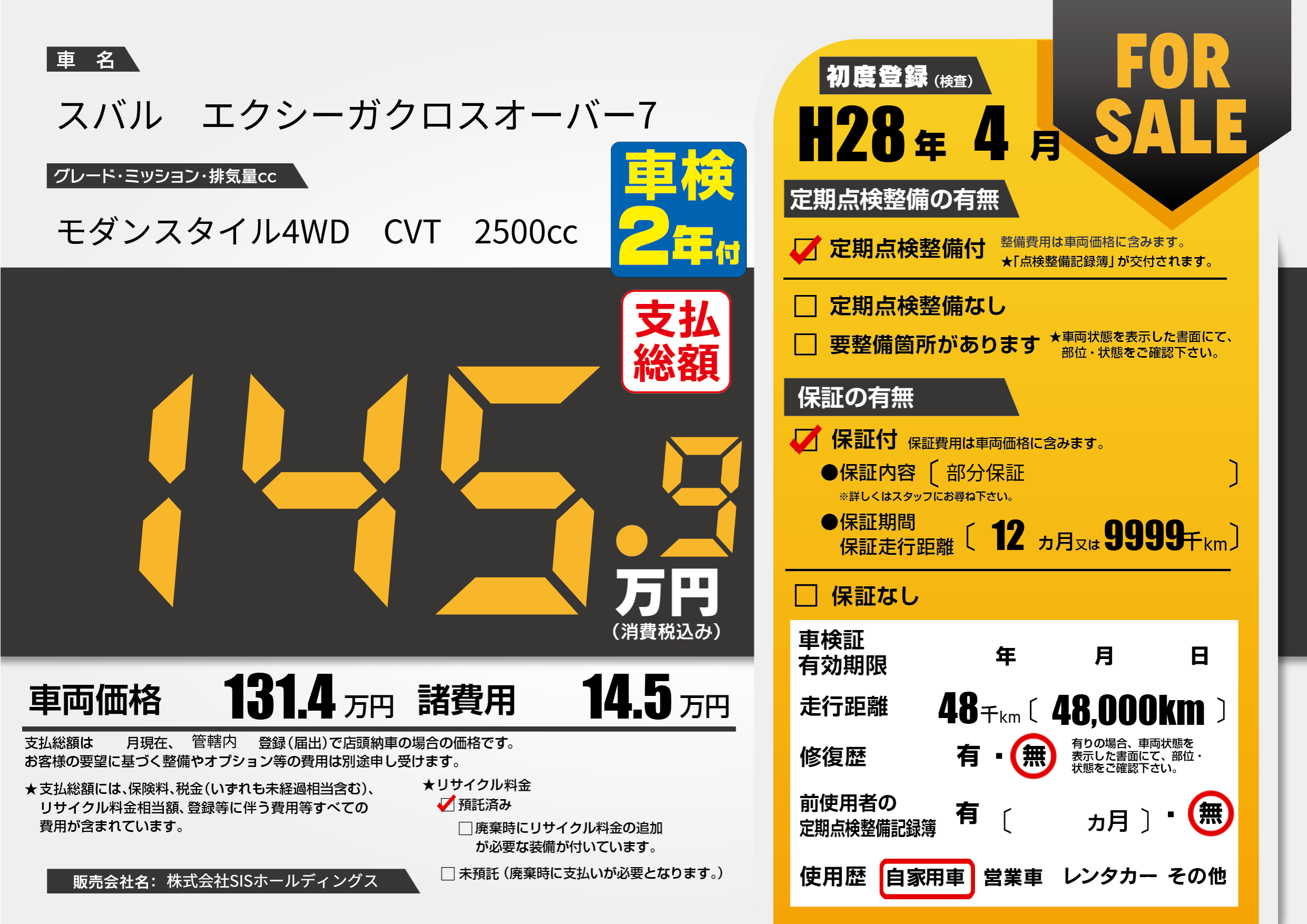 | 車名 | スバル エクシーガクロスオーバー7 | グレード ミッション 排気量 |