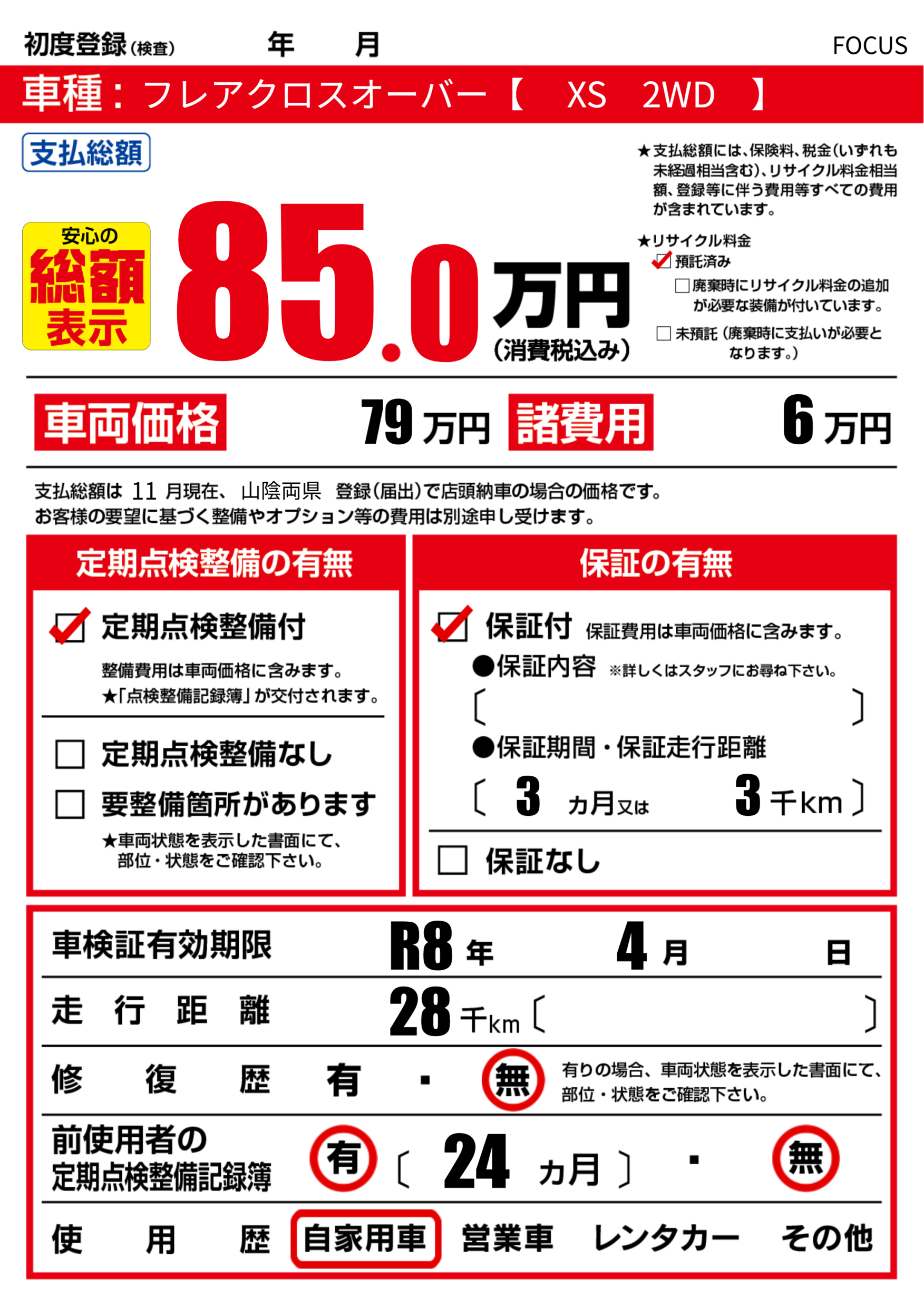 | 車名 | フレアクロスオーバー【 XS 2WD 】 | グレード ミッション 排気量 |