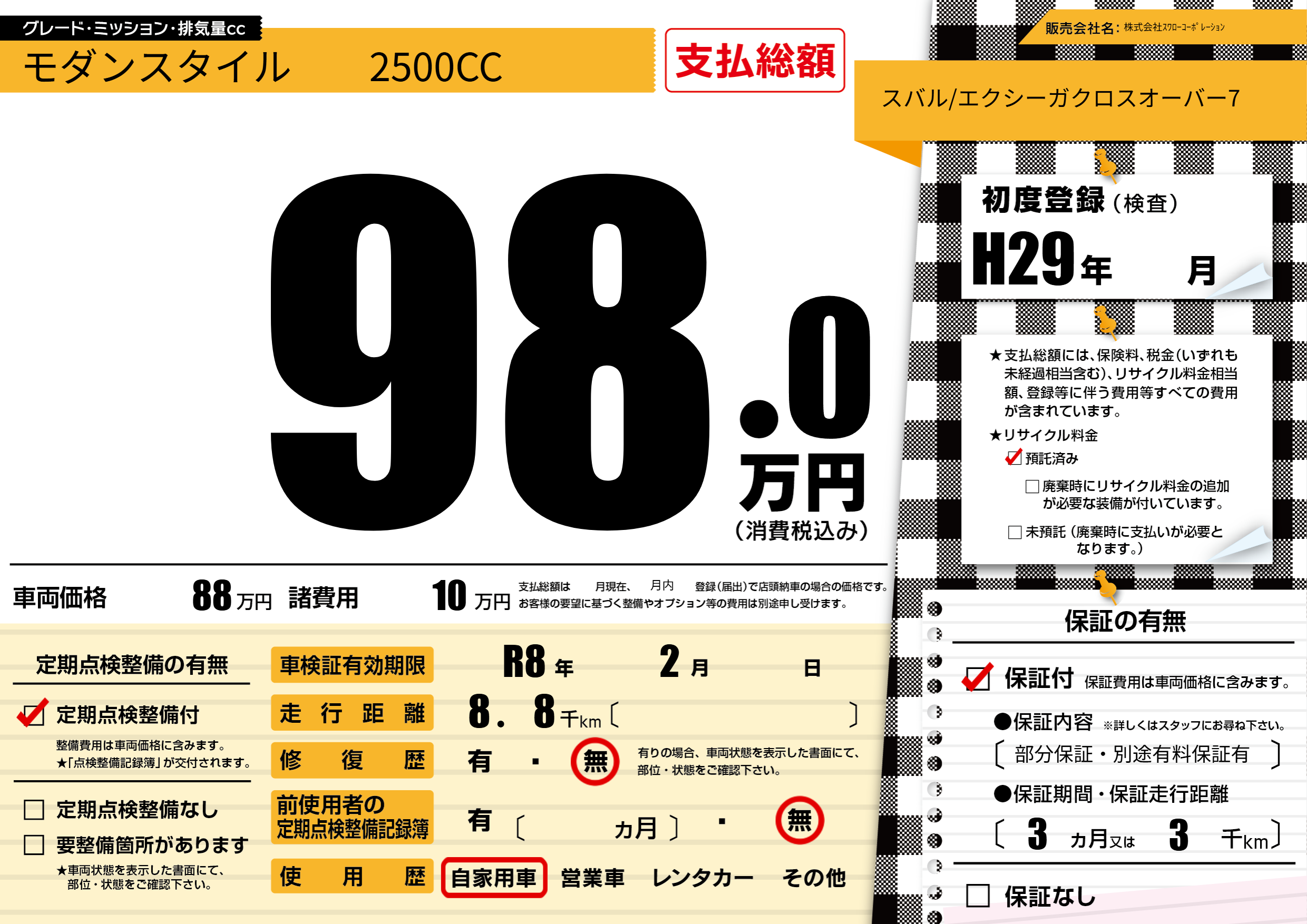 保証付き 保証内容(部分保証・別途有料保証有) 3ヶ月または(3)千kmまで |