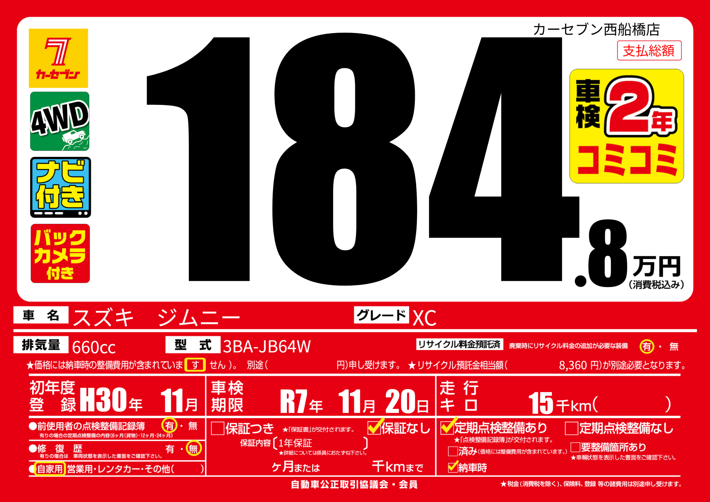 | 定期点検整備 | 定期点検整備あり 納車時あり | ||
