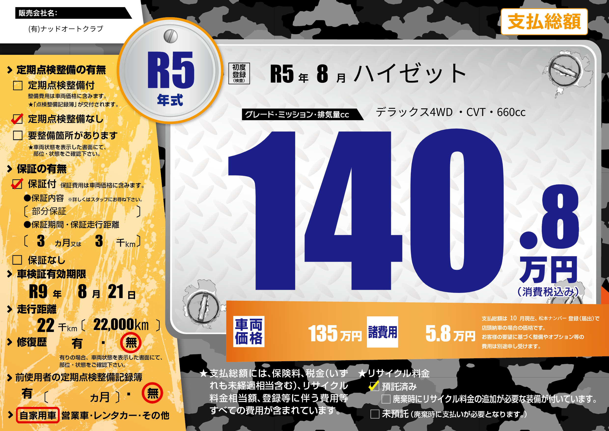 | 走行キロ | 2.2万km | 初年度登録 | R5年8月 |