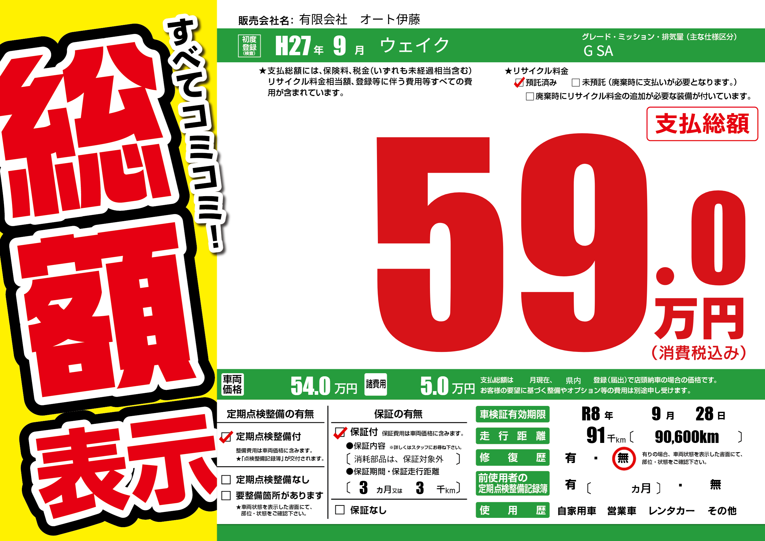 | 走行キロ | 9.1万km | 初年度登録 | H27年9月 |