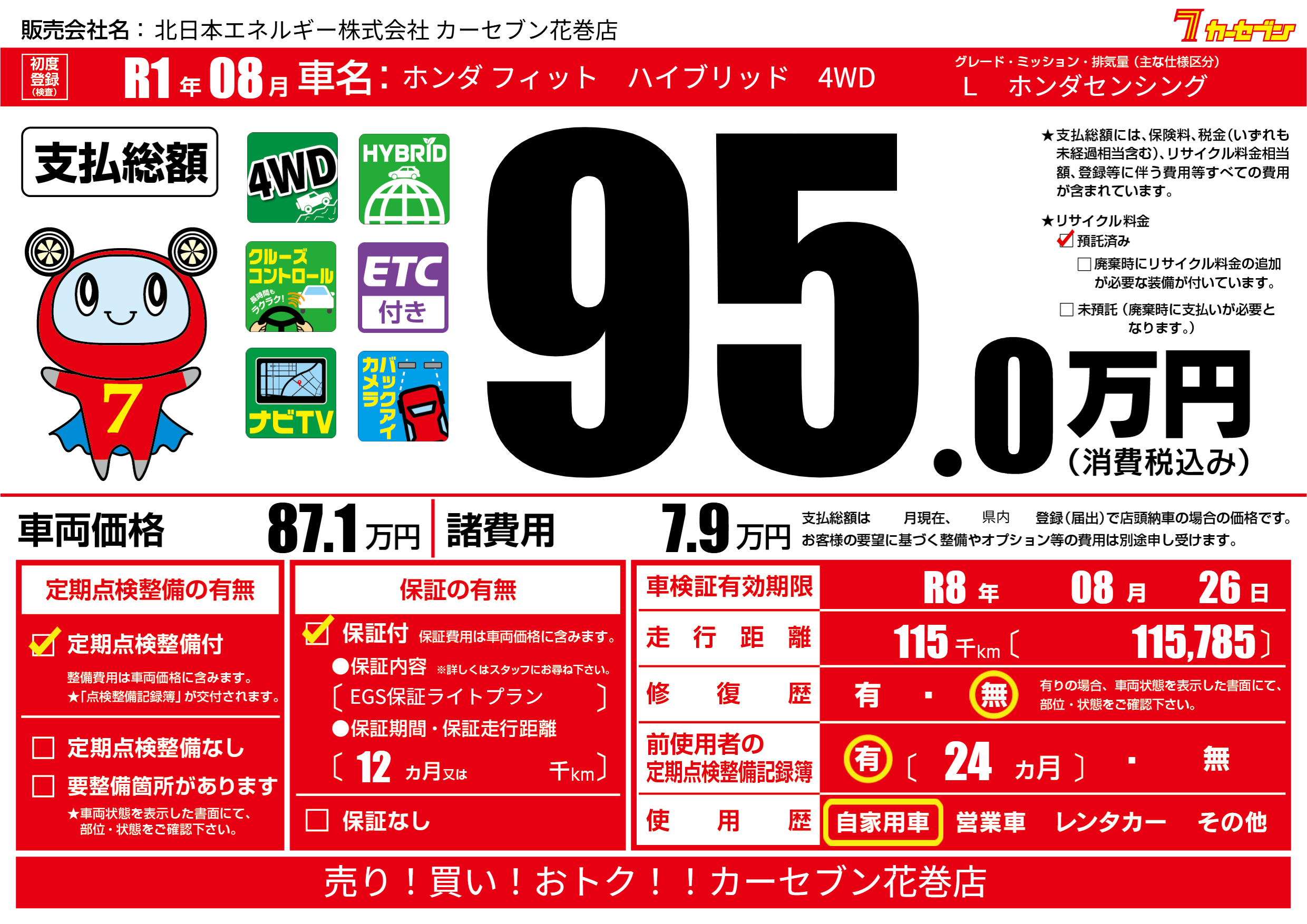 | 車名 | ホンダ フィット ハイブリッド 4WD | グレード ミッション 排気量 |