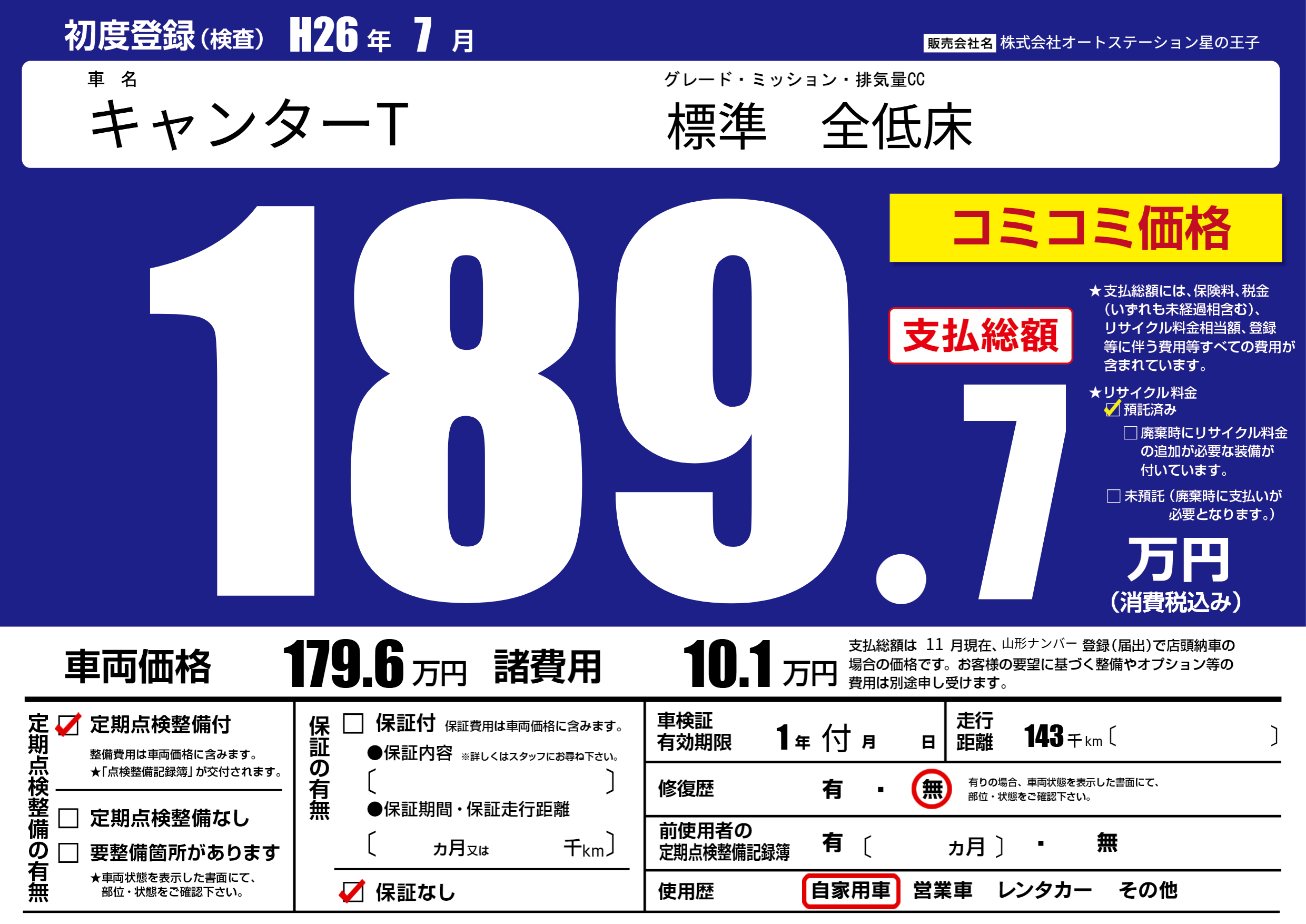 | 走行キロ | 14.3万km | 初年度登録 | H26年7月 |