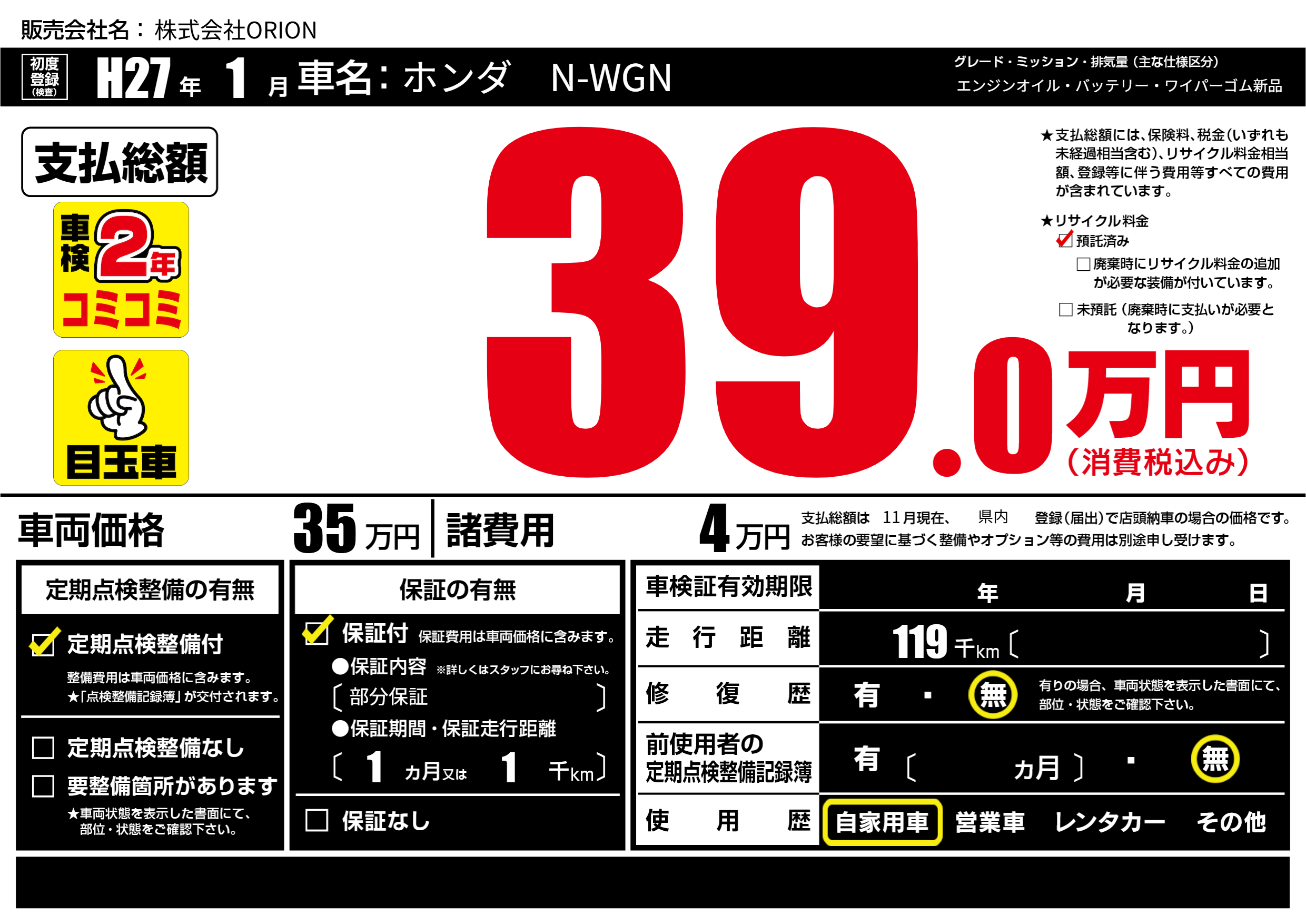| 車名 | ホンダ N-WGN | グレード ミッション 排気量 |