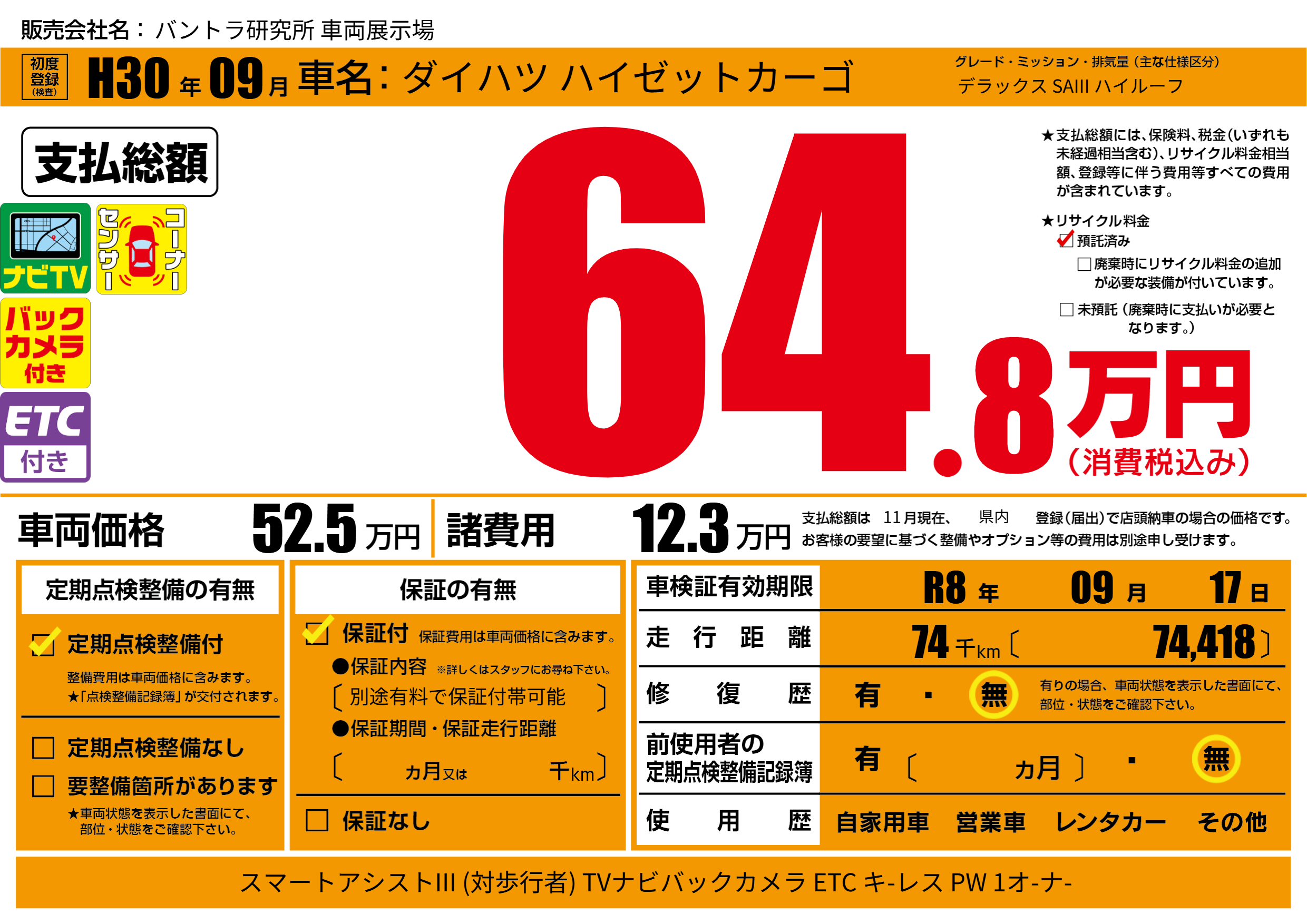 | 走行キロ | 7.4万km | 初年度登録 | H30年09月 |