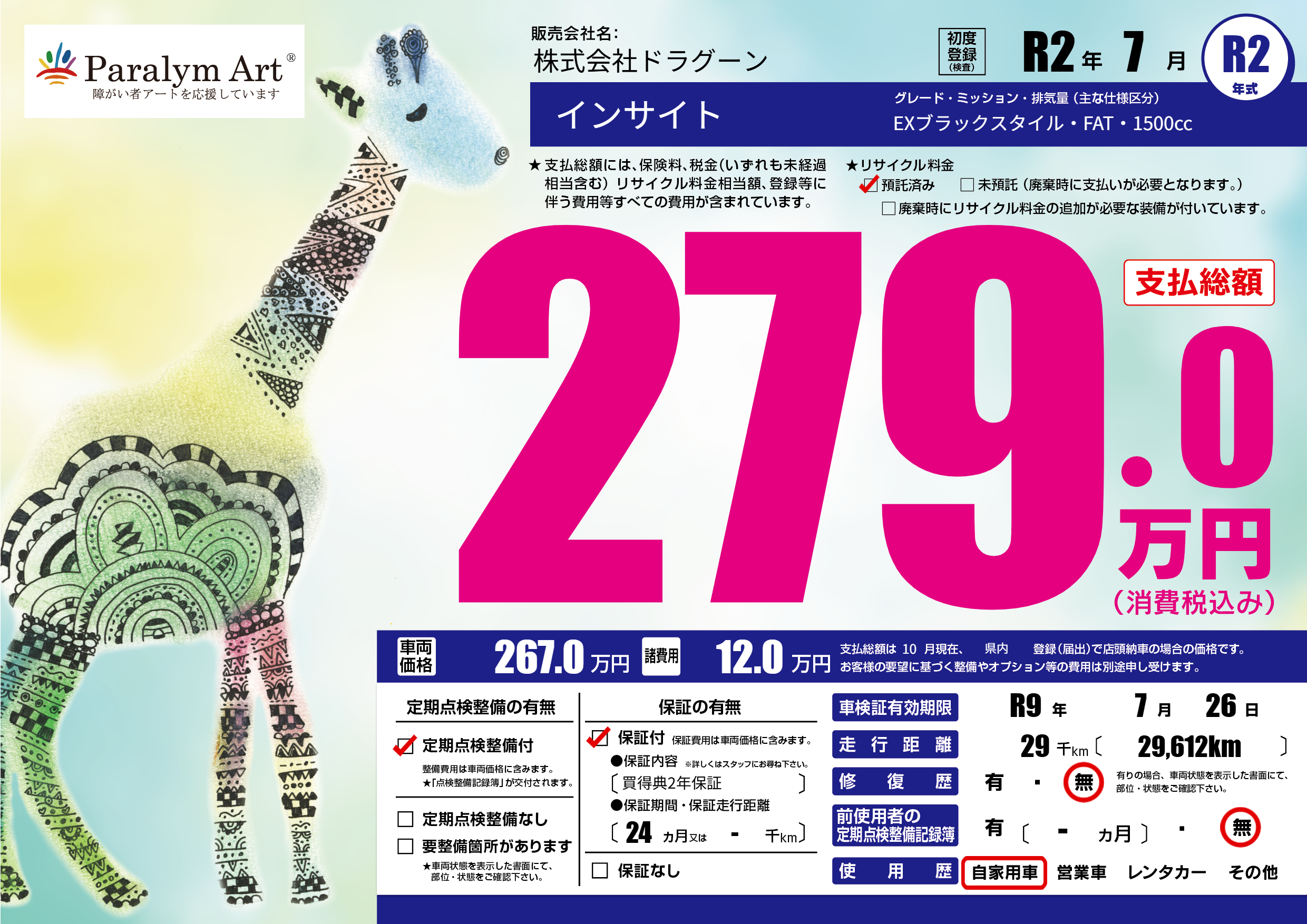 | 車名 | インサイト | グレード ミッション 排気量 |