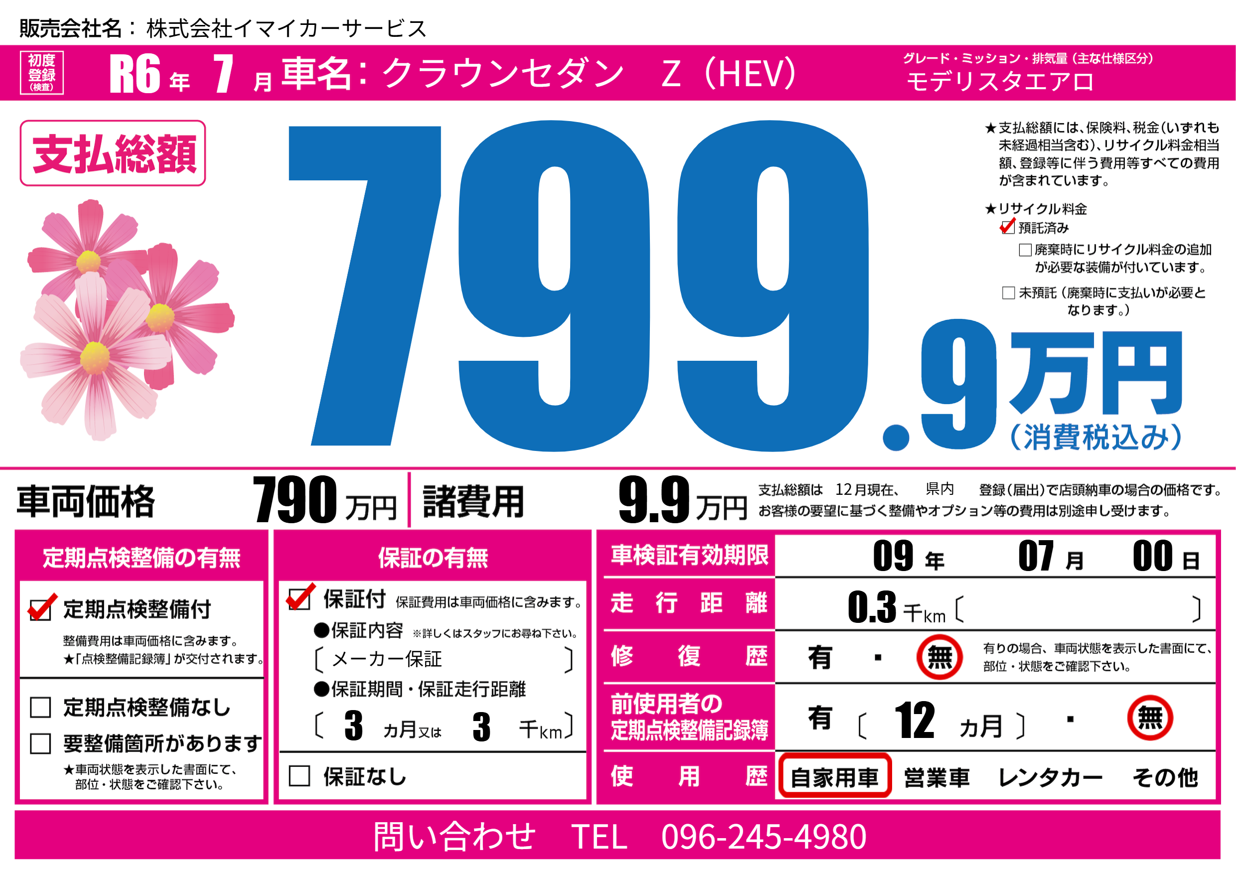 | 車名 | クラウンセダン Z(HEV) | グレード ミッション 排気量 |