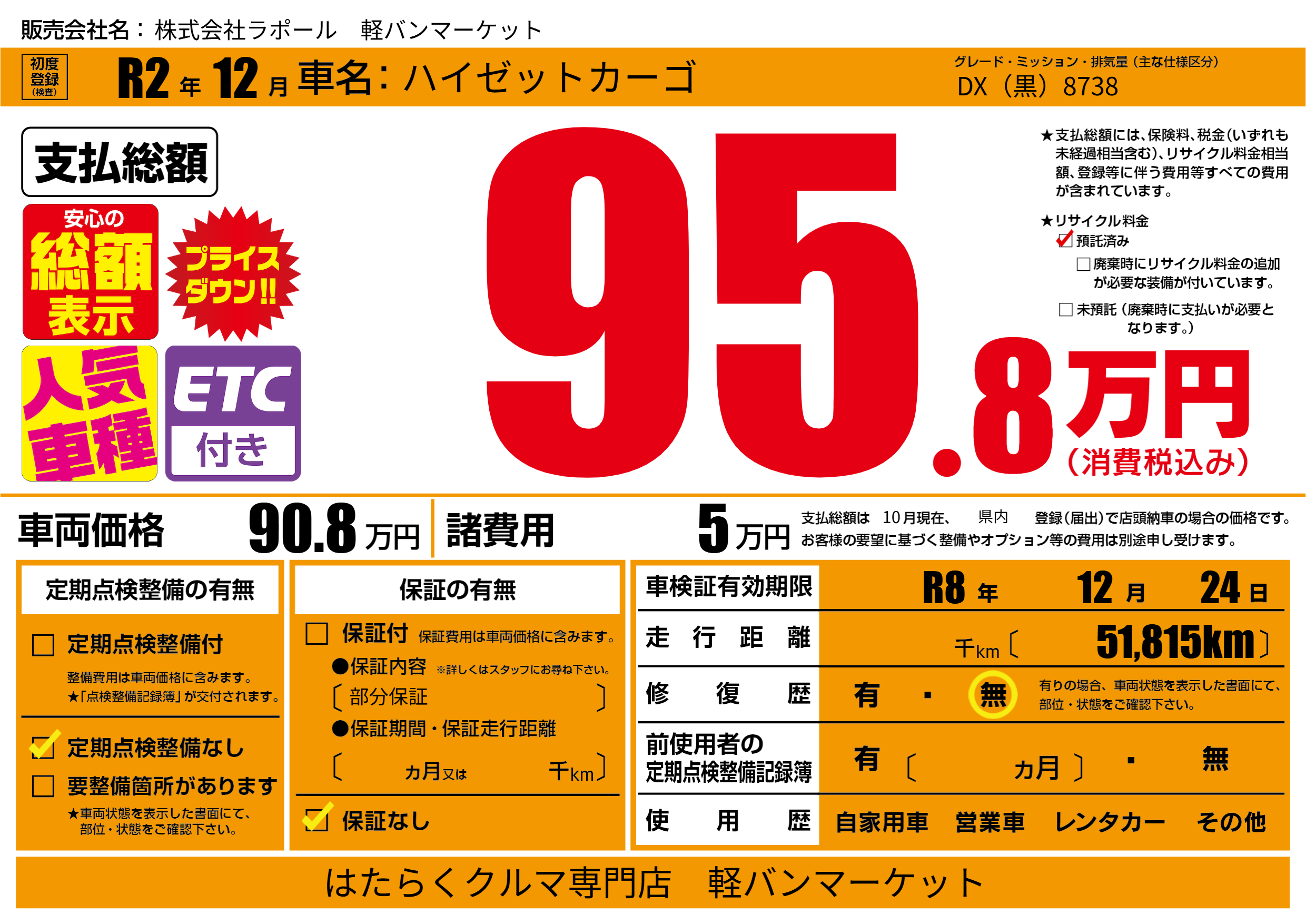 | 車名 | ハイゼットカーゴ | グレード ミッション 排気量 |