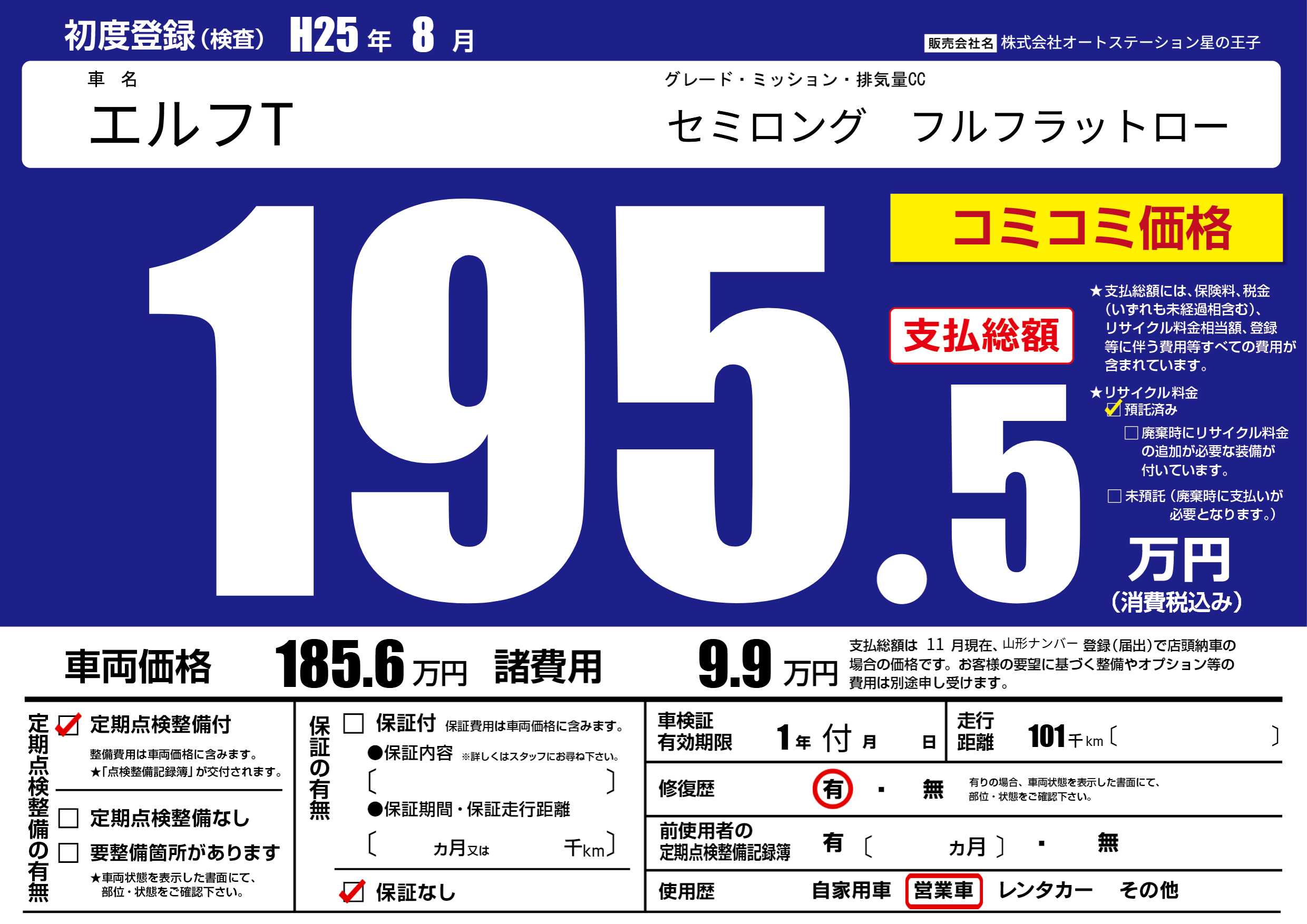 | 走行キロ | 10.1万km | 初年度登録 | H25年8月 |