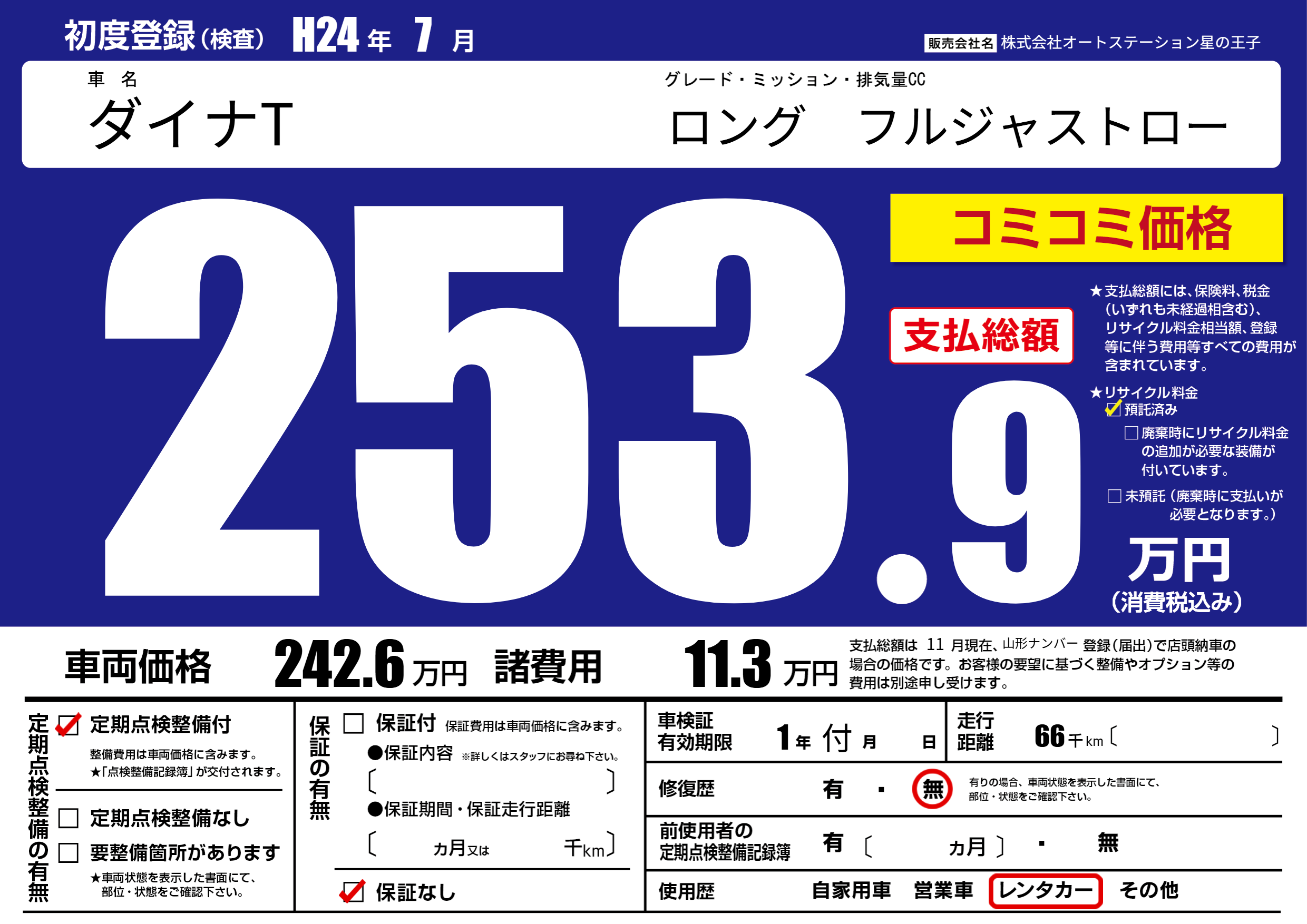 | 走行キロ | 6.6万km | 初年度登録 | H24年7月 |
