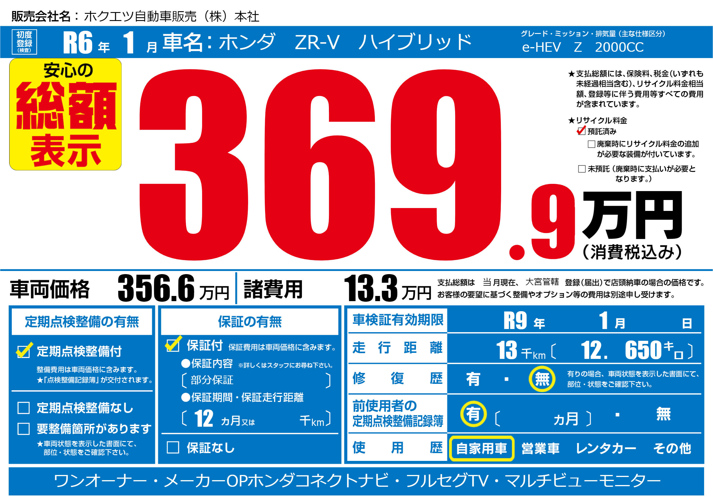| 車名 | ホンダ ZR-V ハイブリッド | グレード ミッション 排気量 |