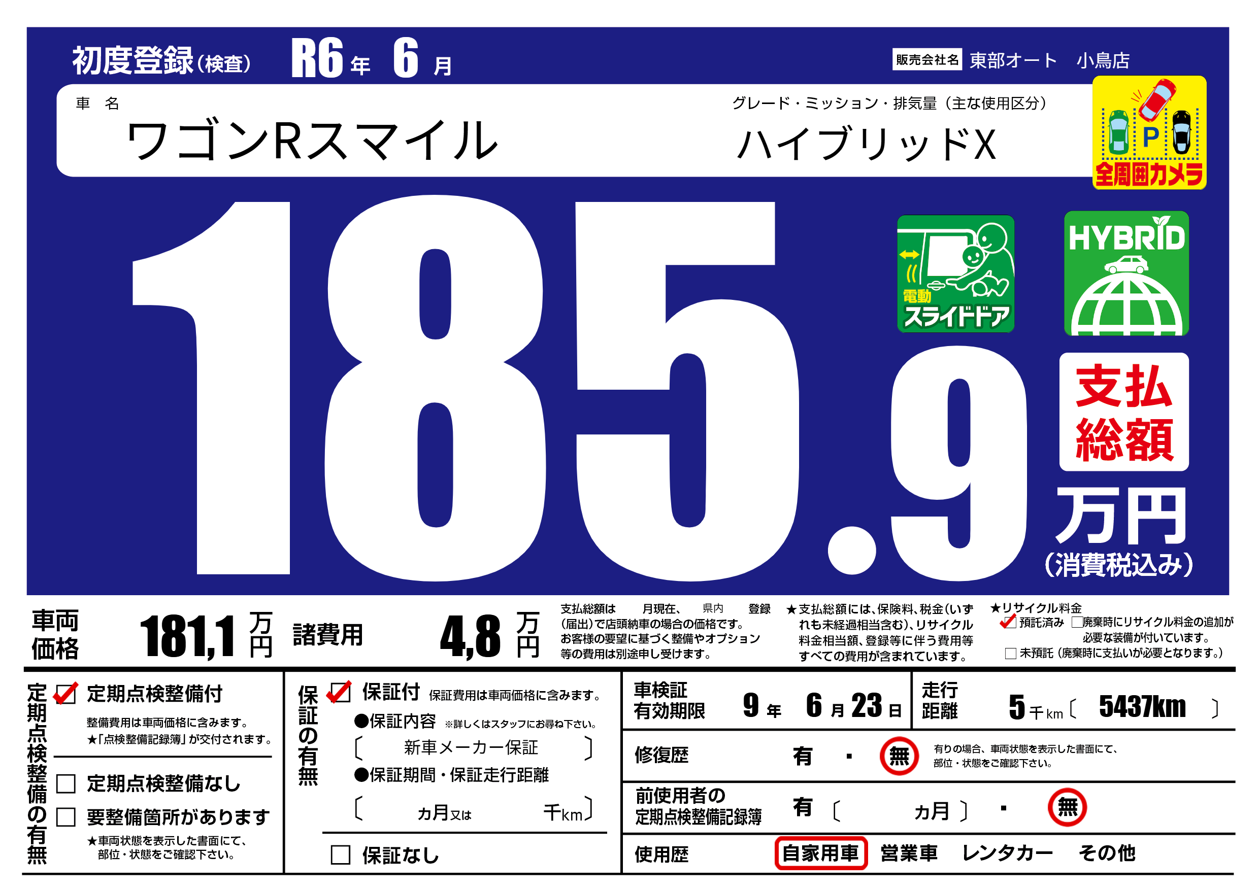 | 走行キロ | 0.5万km | 初年度登録 | R6年6月 |
