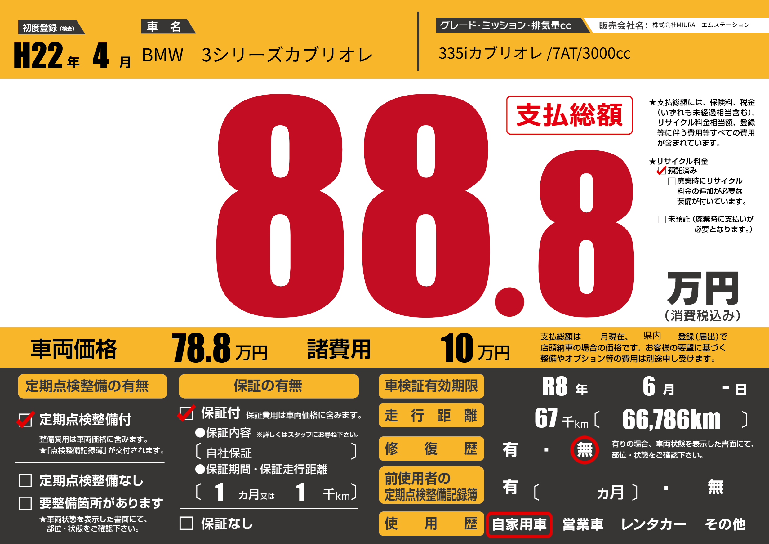 | 車名 | BMW 3シリーズカブリオレ | グレード ミッション 排気量 |