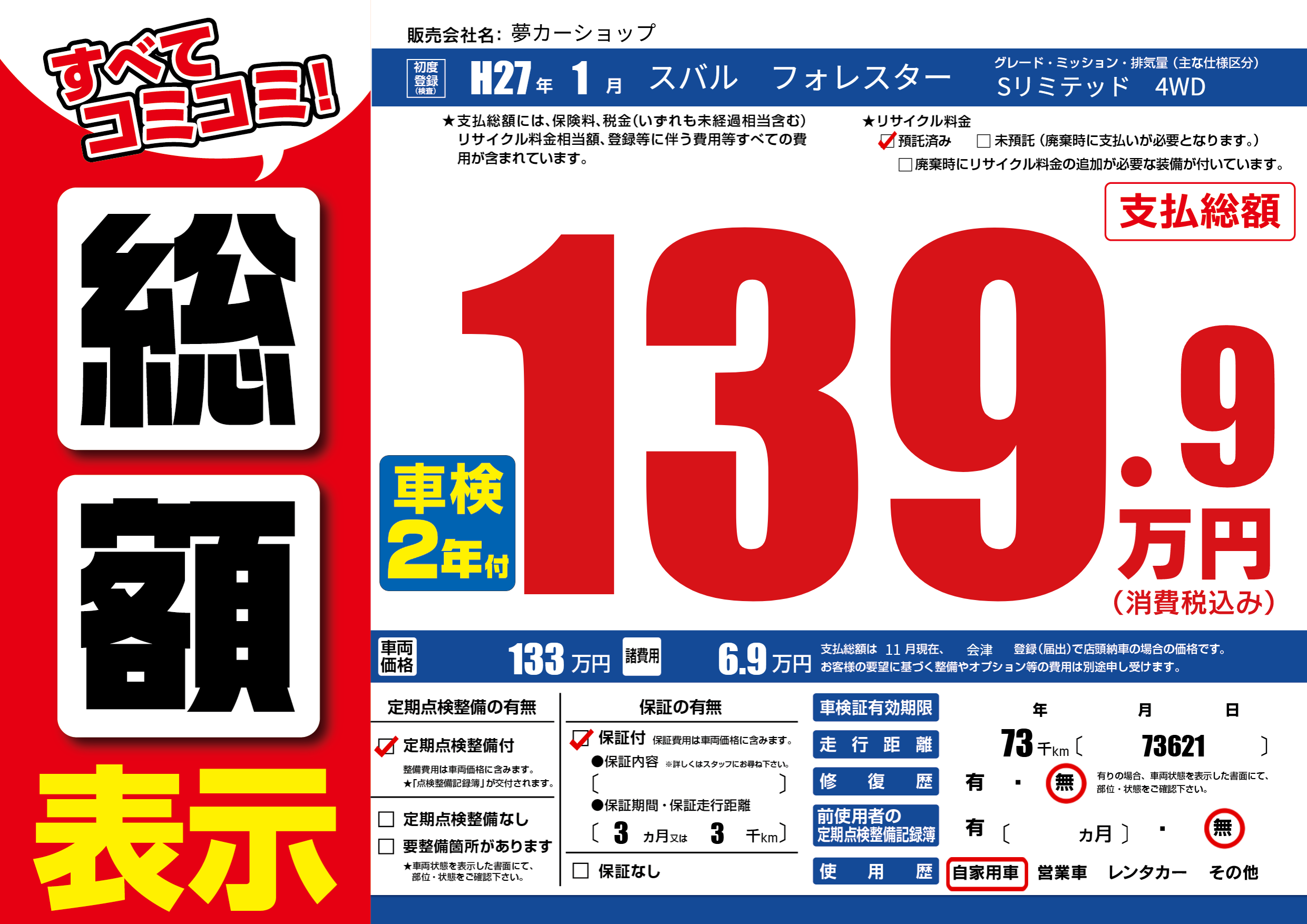 | 車名 | スバル フォレスター | グレード ミッション 排気量 |